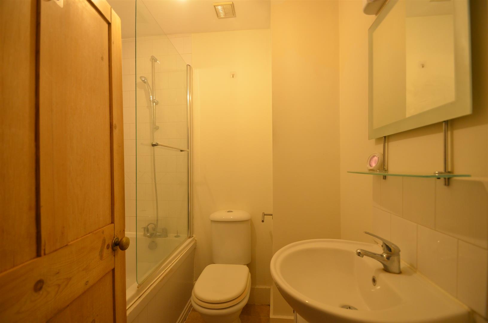 Panel enclosed bath with mixer tap and shower attachment, glass shower screen, low level w.c, pedestal wash hand basin with tiled splashback, extractor fan.