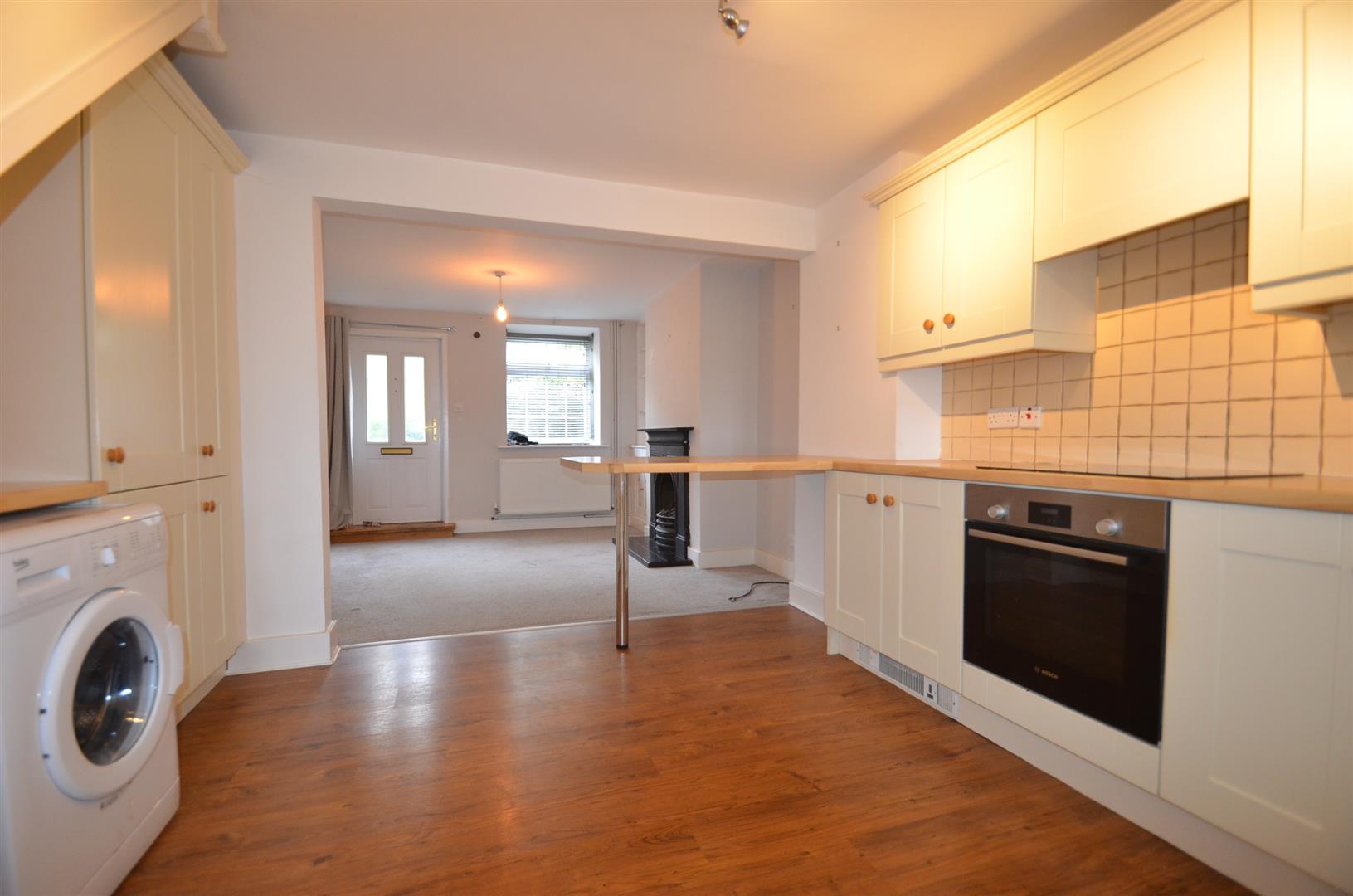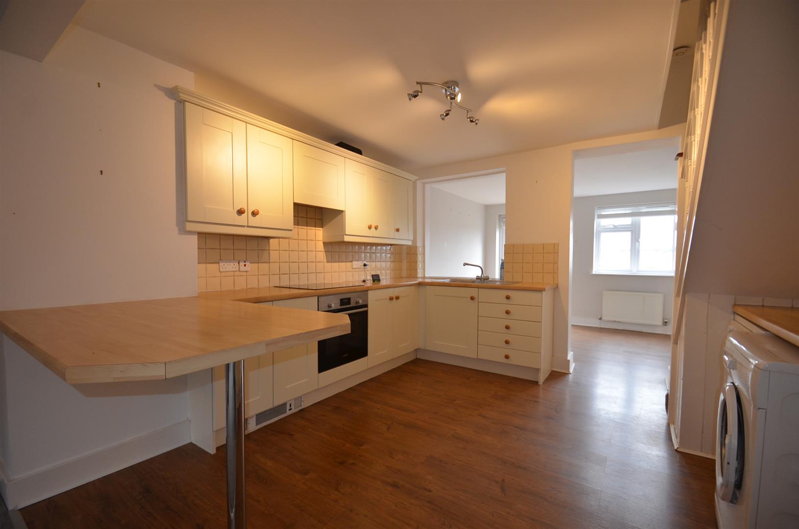 Fitted kitchen with a range of base and eye level units with roll top work surfaces, stainless steel sink unit with mixer tap, tiled splashback, integrated oven and hob, plumbing for washing machine and dishwasher, stairs leading to first floor, opening i