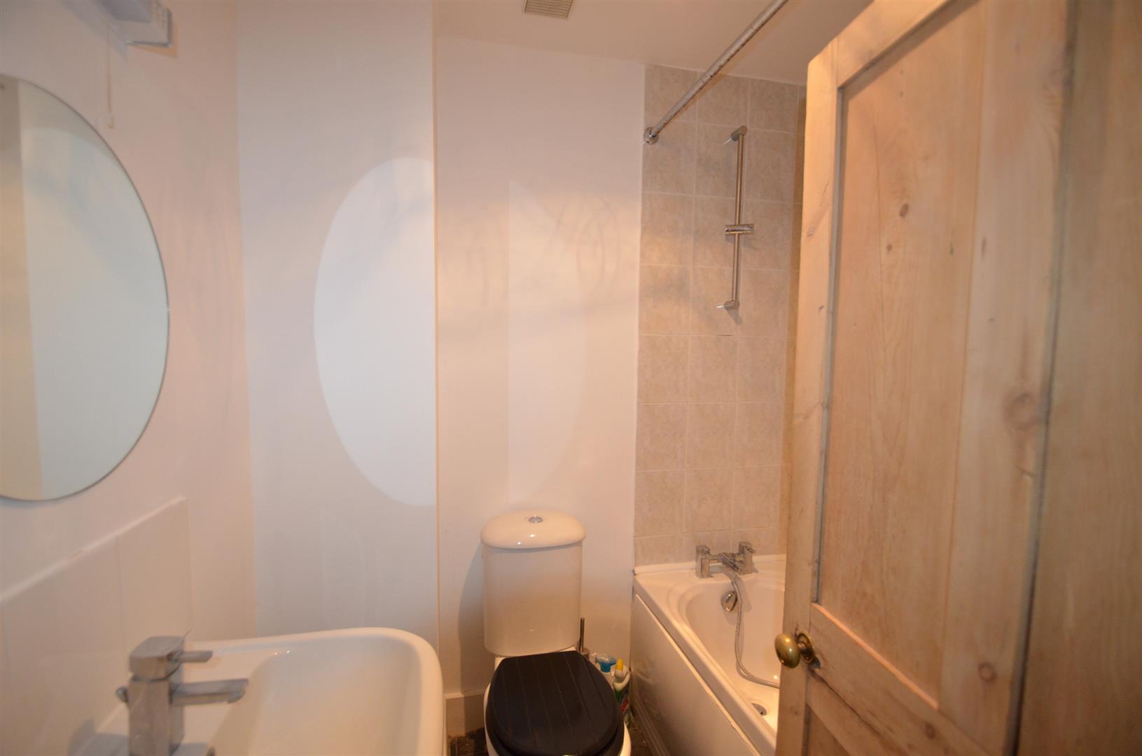 White suite comprising of panel enclosed bath with mixer tap and wall mounted shower attachment, low level w.c, pedestal wash hand basin, part tiled walls, extractor fan.