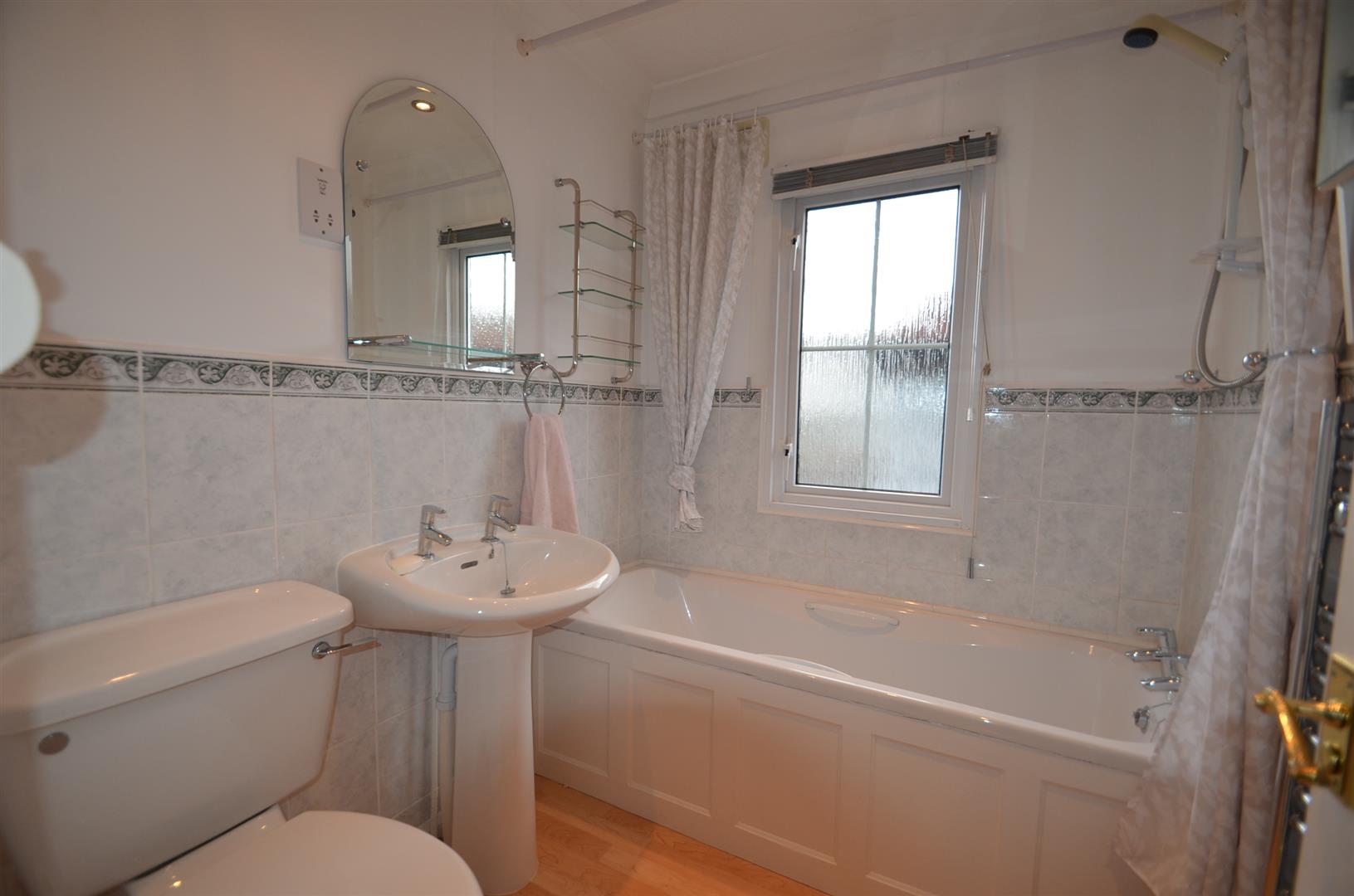 White suite comprising of panel enclosed bath with wall mounted shower over, low level w.c, pedestal wash hand basin, extractor fan, part tiled walls, window to side.