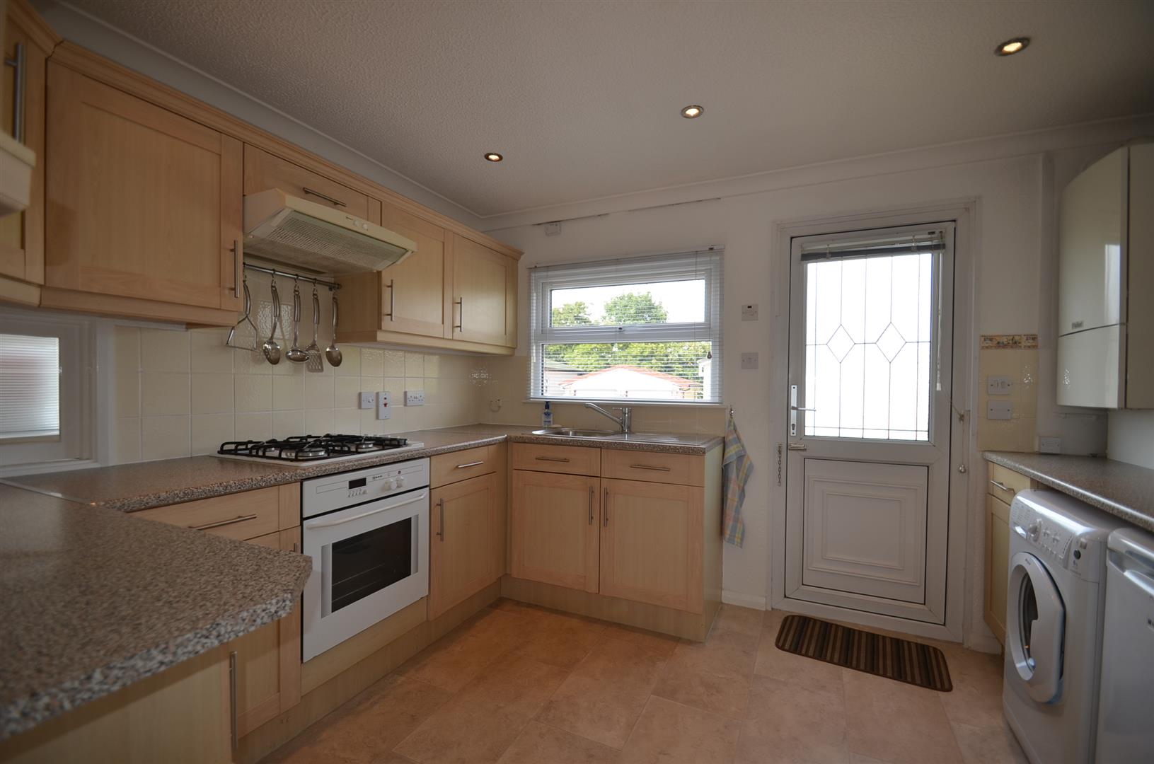 Fitted with a range of base and eye level units with roll top work surfaces, stainless steel sink unit with mixer tap, integrated oven and hob, tiled splash back, wall mounted gas boiler, plumbing for washing machine, service hatch to dining area, inset s