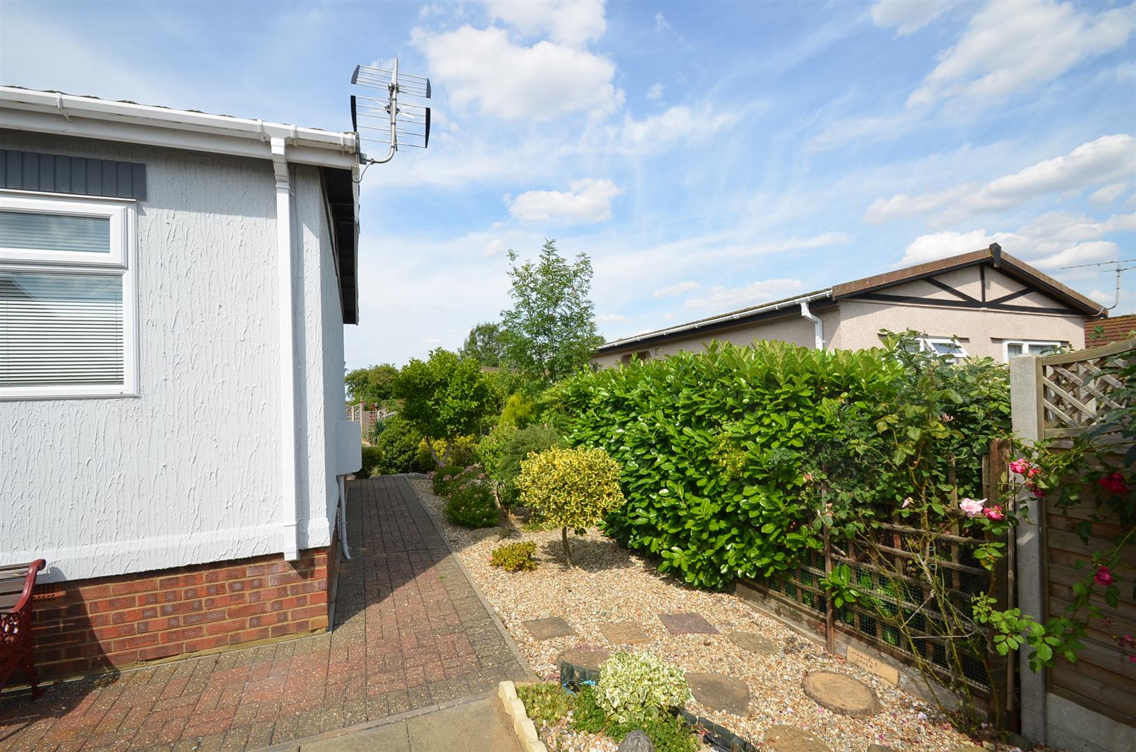 Block paved driveway leading to garage, low maintenance landscaped areas, path leading to front door, gated access to rear garden.