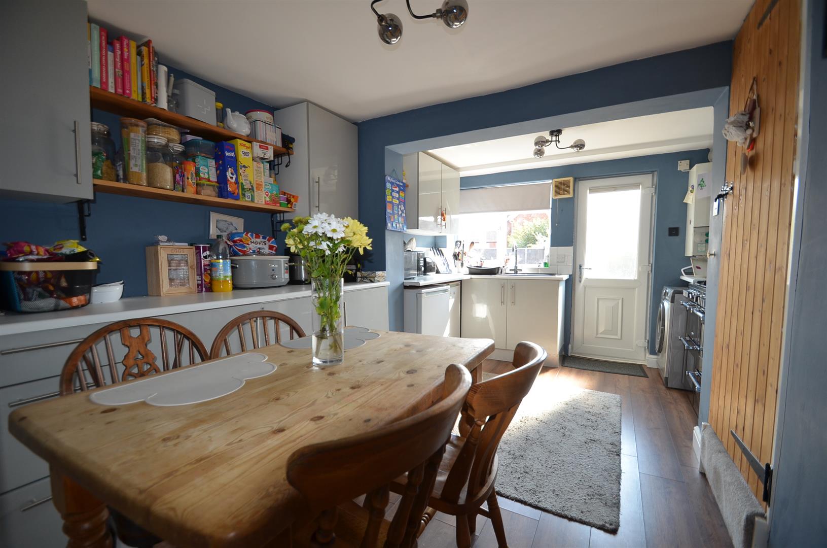 Range of base and eye level units with roll top work surfaces, stainless steel sink unit with mixer tap, integrated oven and hob, wall mounted gas boiler, uPVC door to garden, window to rear, stairs leading to first floor, understairs cupboard.