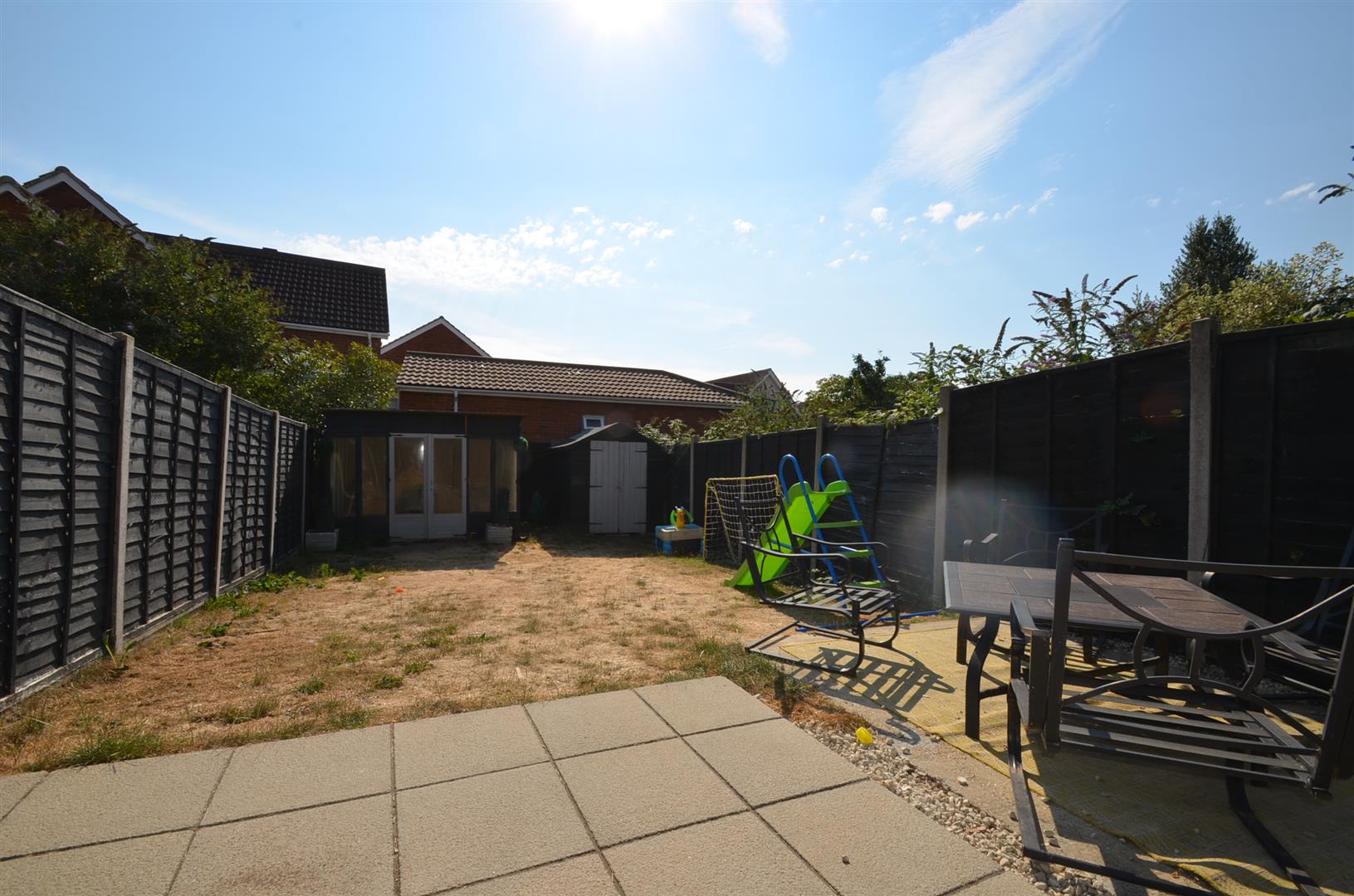 Patio area, steps down to large fully enclosed lawned area, with additional patio, summer house. Shared passageway leading to front of property.