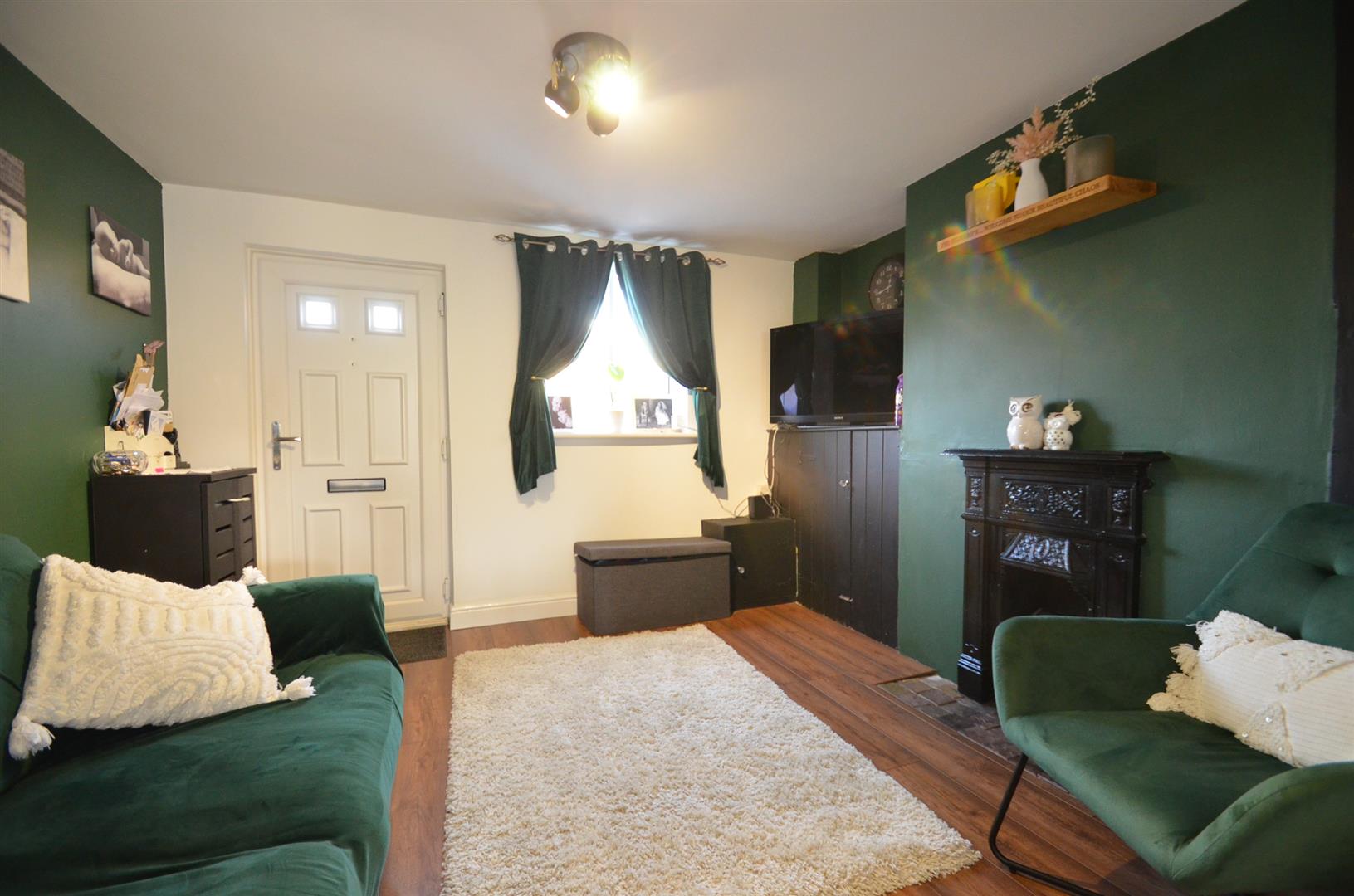 Window to front, uPVC double glazed entrance door, radiator, laminate flooring, cast iron fireplace with hearth.