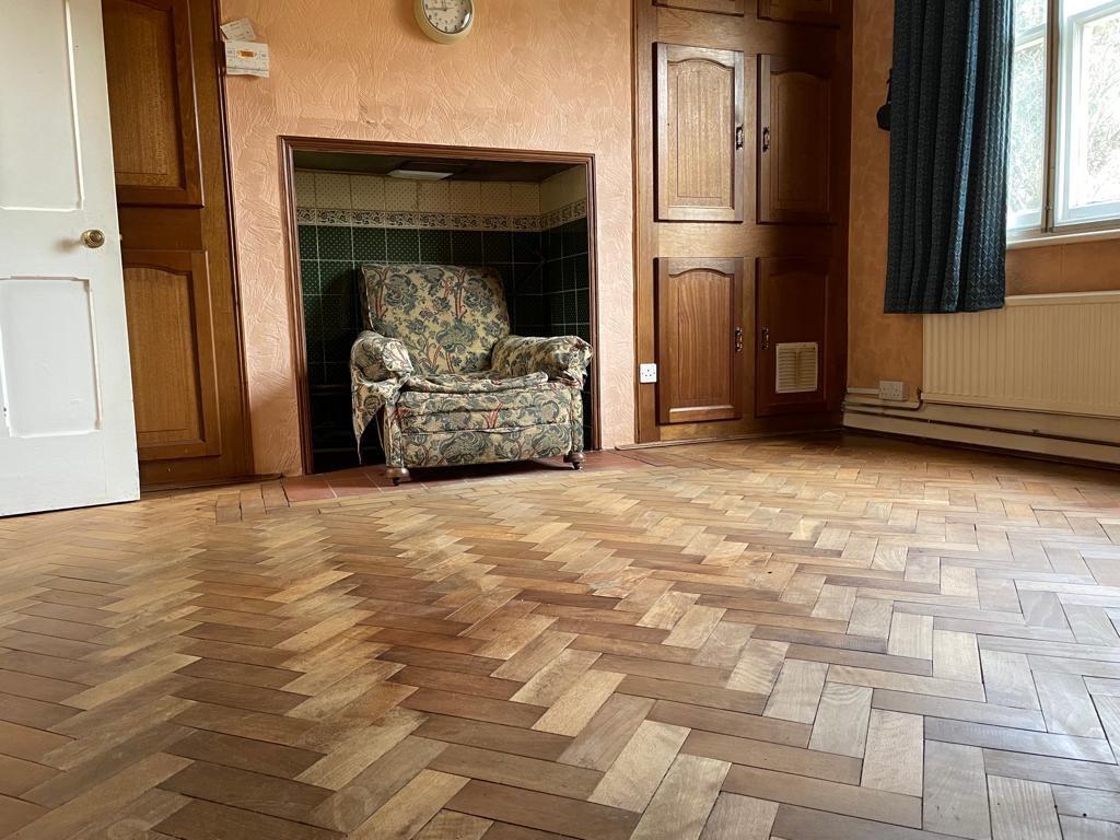 Original Parquet flooring, two recessed storage cupboards, wall mounted gas boiler, radiator, window to side.