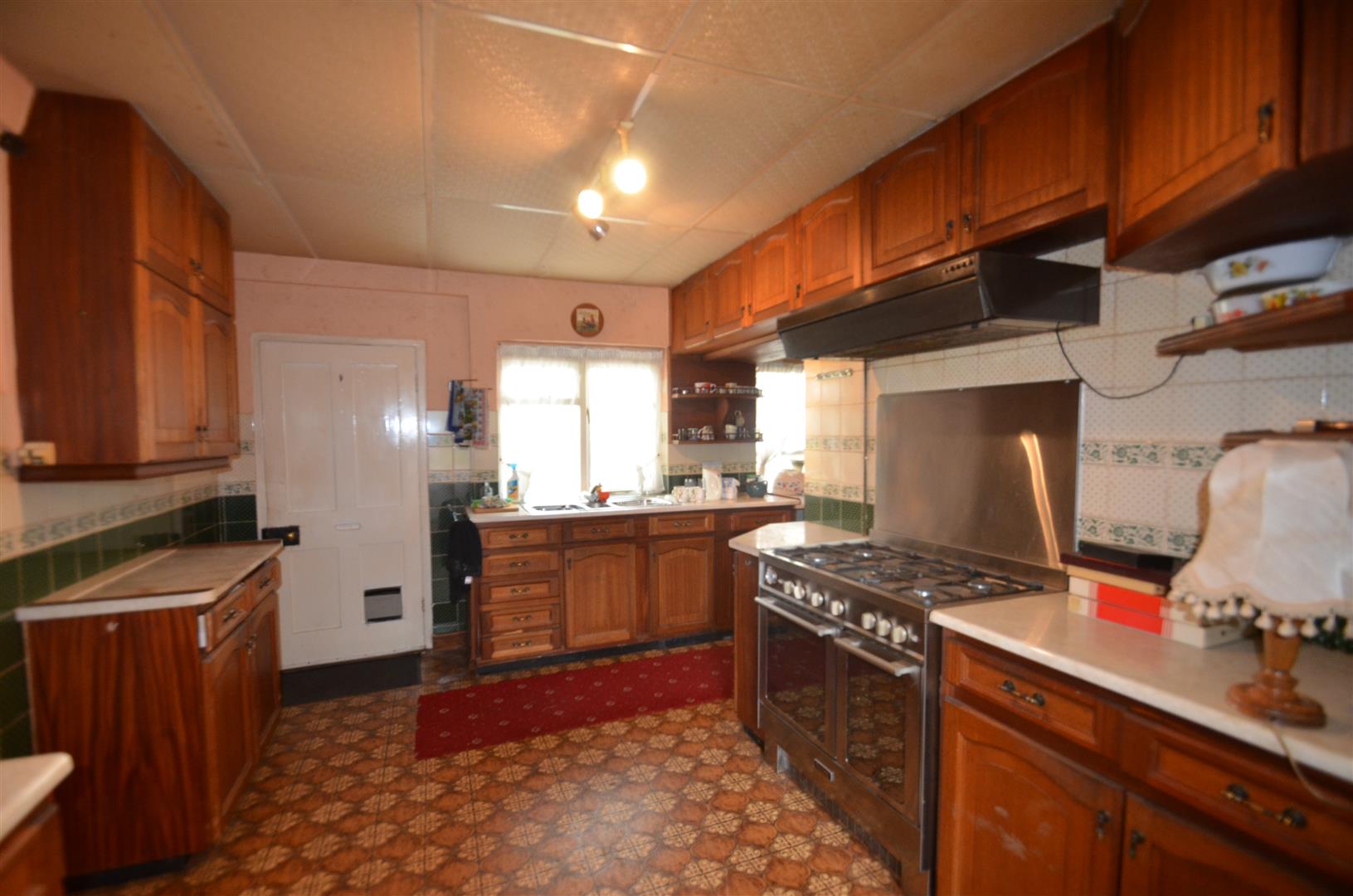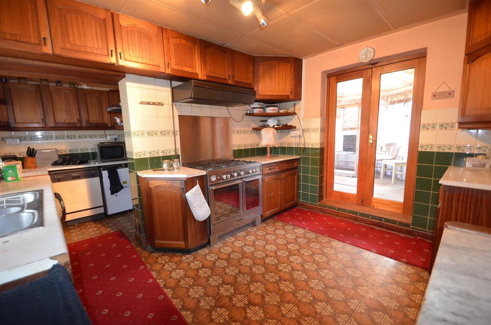 Window to side, base and wall mounted units with work surfaces over, plumbing for washing machine and dish washer, sliding door to:-