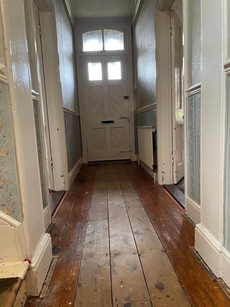 Entrance door, radiator, stairs to first floor, steps down to cellar.