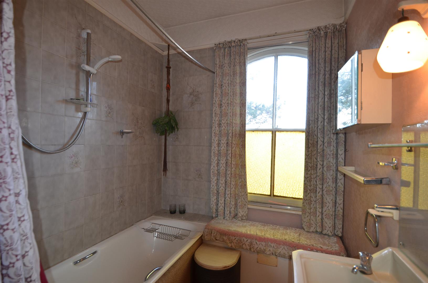 Suite comprising of panel enclosed bath, wall mounted shower, part tiled walls, wash hand basin, heated towel rail, window to front.