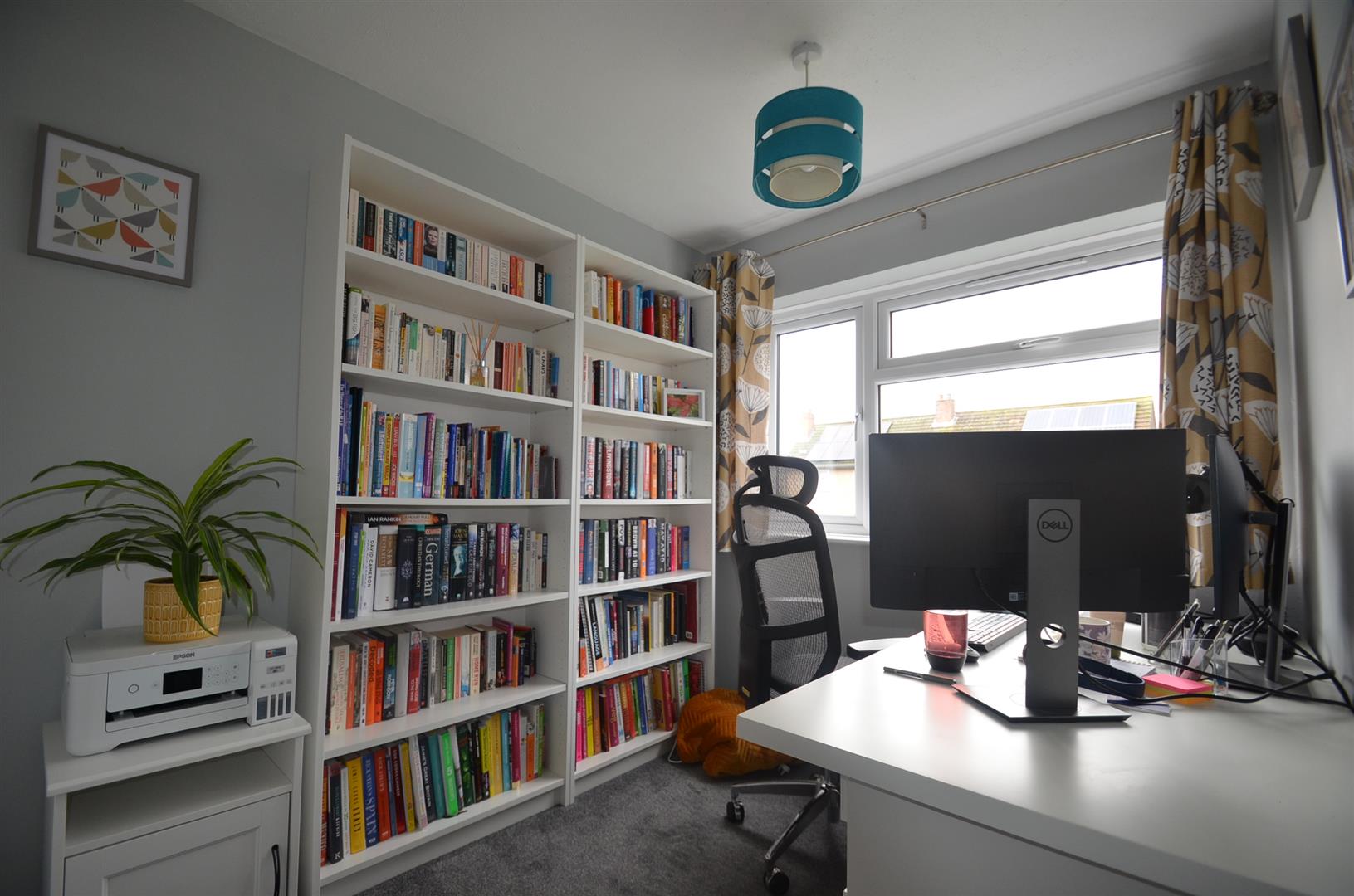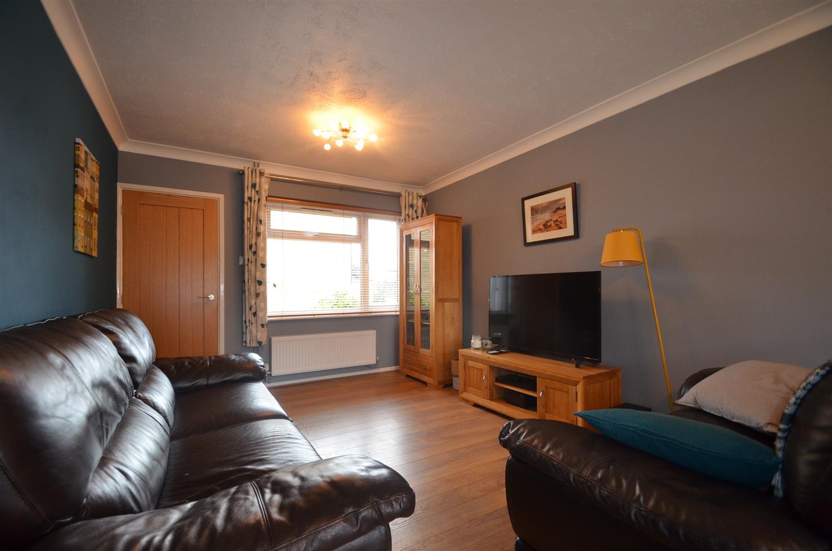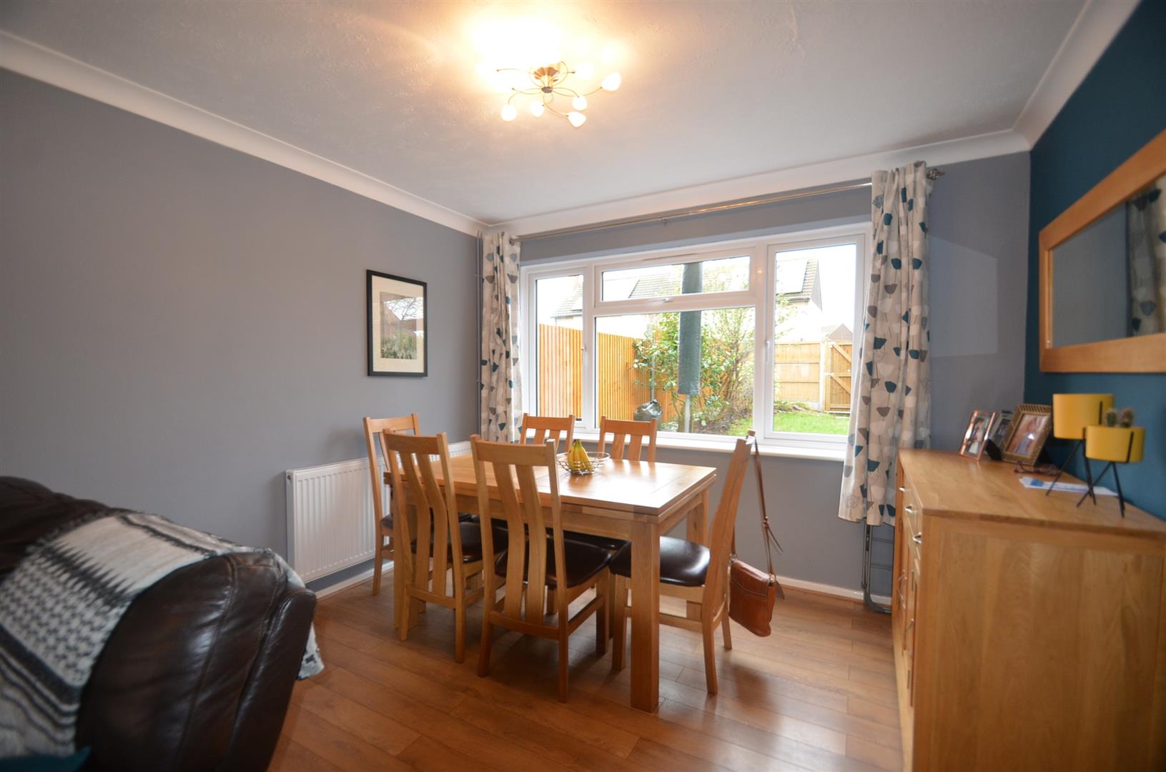 A large dual aspect room with window to front and rear, two radiators, wood effect flooring.