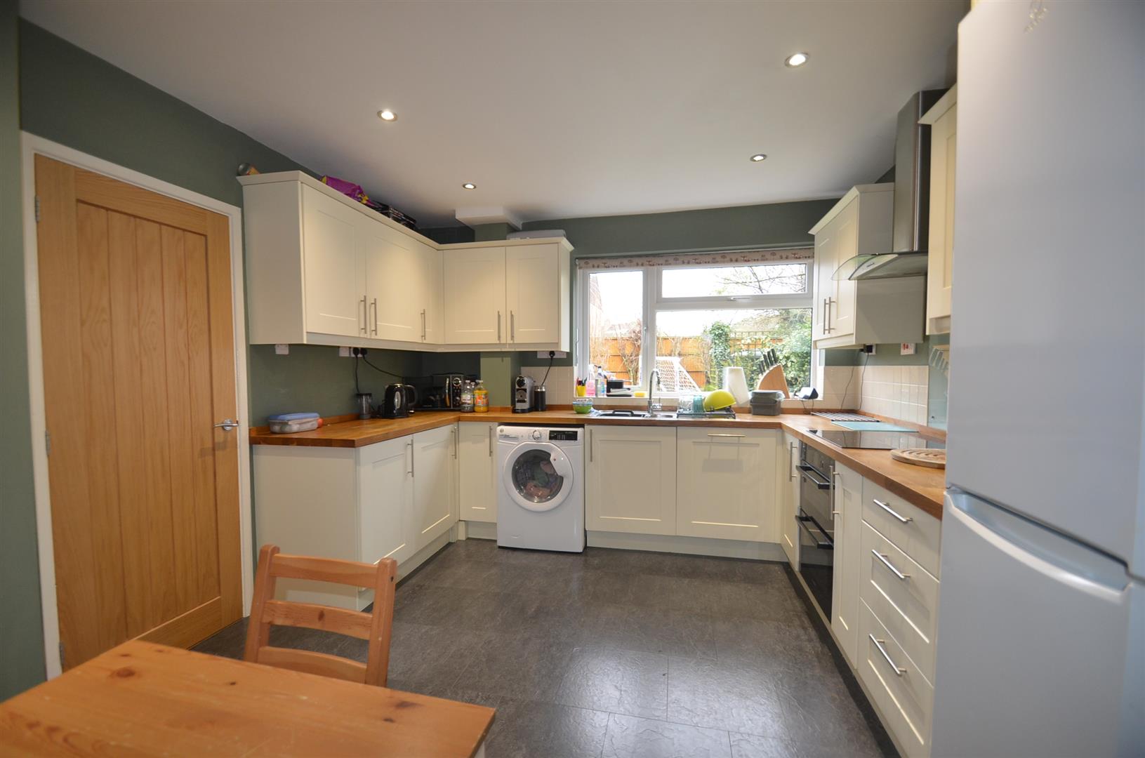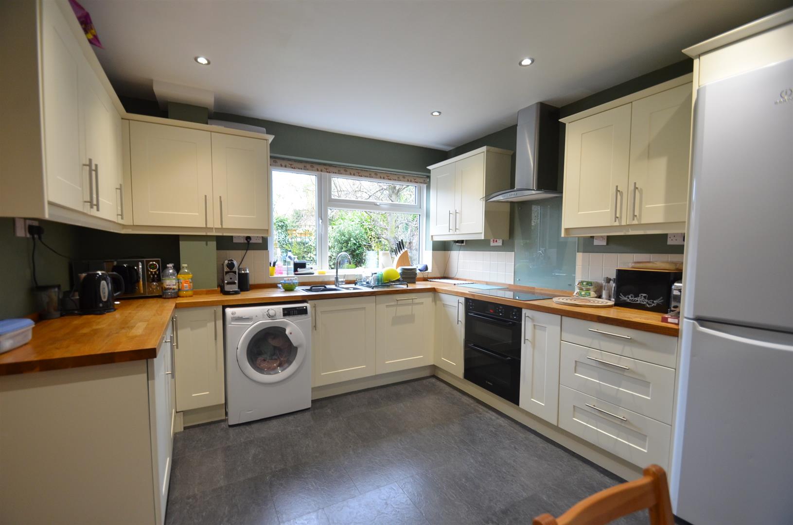 Fitted kitchen with a range of base and eye level units with wood block work surfaces, one and a half stainless steel sink unit with mixer tap, integrated double oven and hob with stainless steel extractor hood over, integrated dishwasher, plumbing for wa
