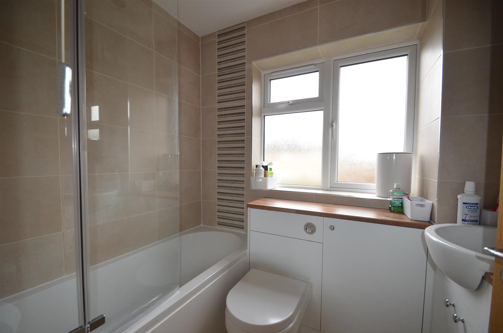 Refitted white suite comprising of panel enclosed bath, mixer tap, wall mounted shower, glass shower screen, low level w.c and wash hand basin in vanity units, window to rear, fully tiled walls.