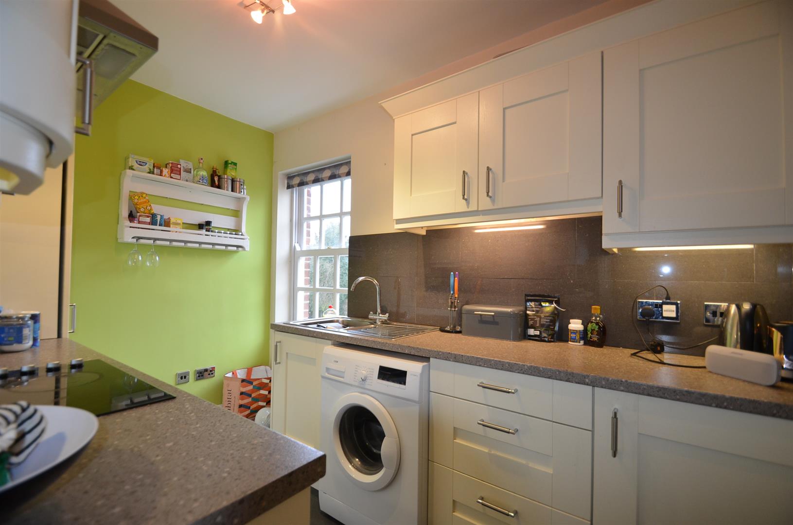 A modern, fitted kitchen with a range of base and eye level units with roll top work surfaces, stainless steel sink unit with mixer tap, tiled splash back, integrated electric oven with hob, integrated under counter fridge and freezer, plumbing for washin