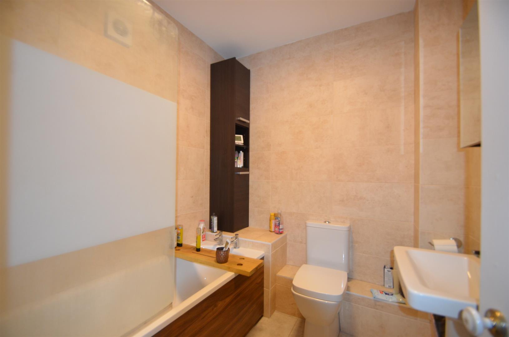 Modern, white suite comprising of panel enclosed bath, wall mounted shower, glass shower screen, low level WC, pedestal wash hand basin, heated towel rail, fully tiled walls, tiled floor.