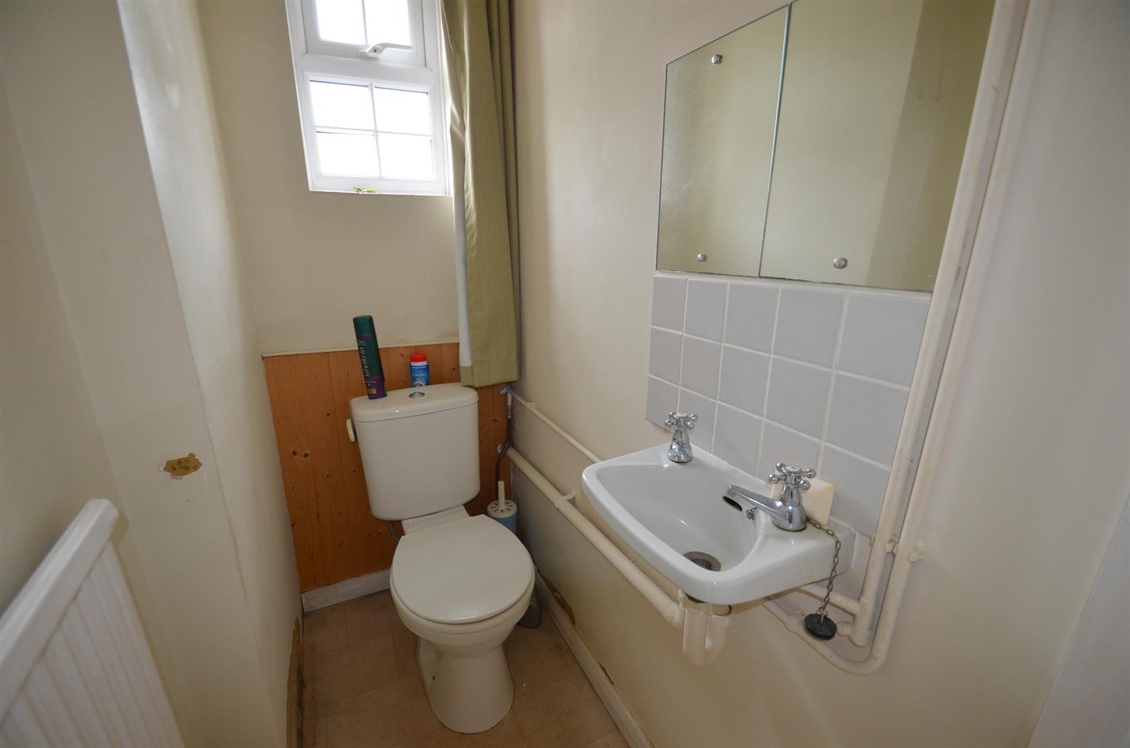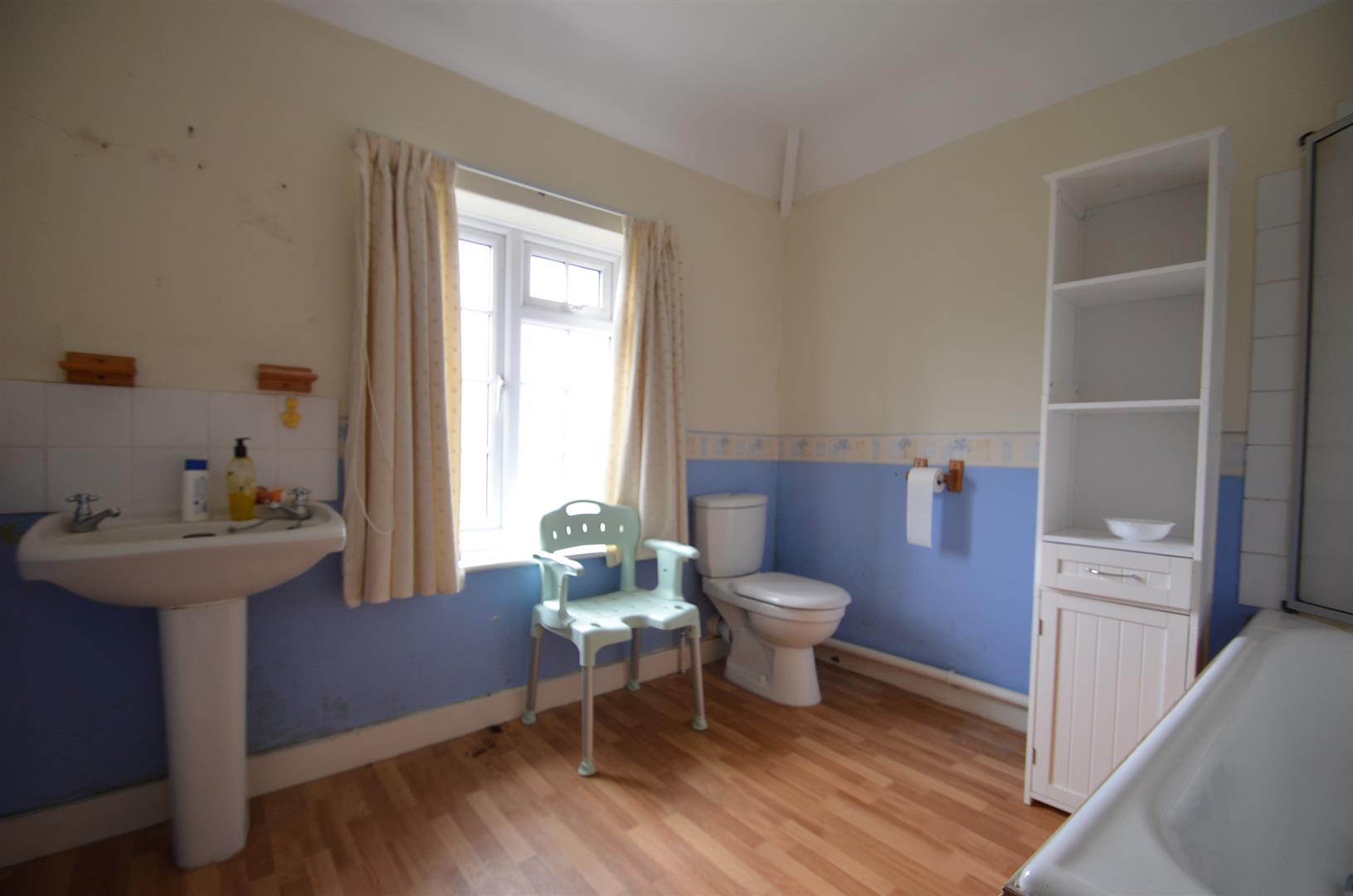White suite comprising of low level w.c, wash hand basin with tiled splash back, window to front, radiator.