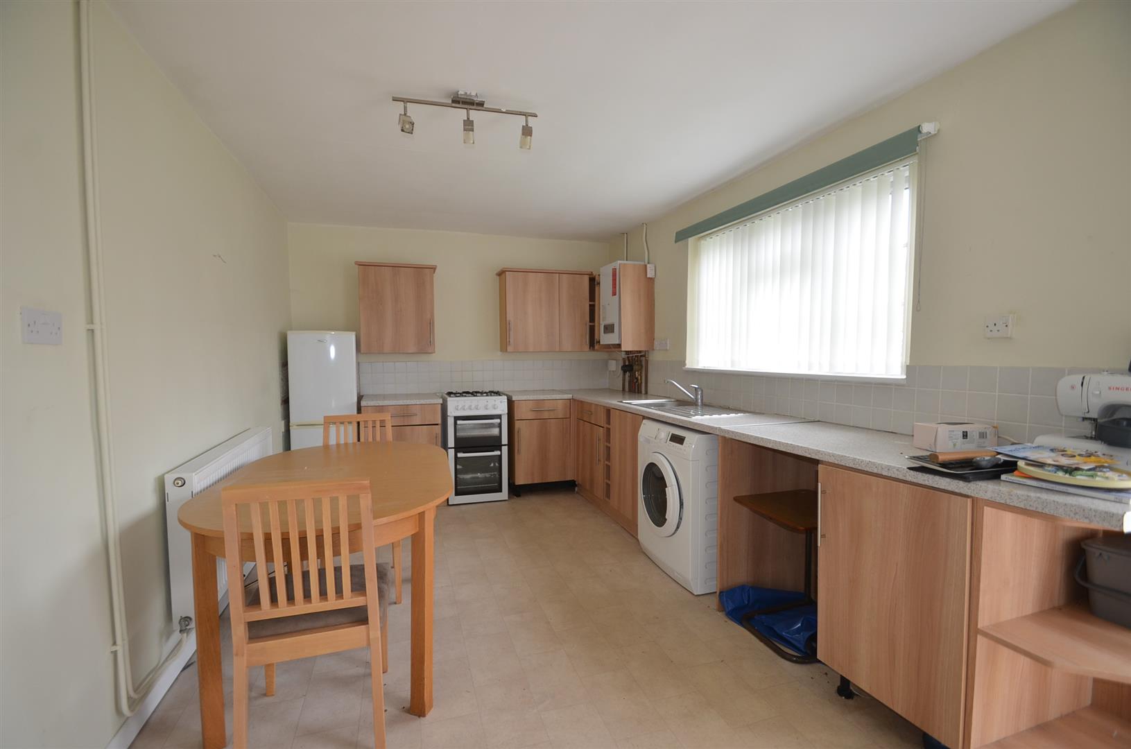 Range of base and eye level units with roll top work surfaces, stainless steel sink unit with mixer tap, tiled splash back, radiator, wall mounted boiler, entrance door, window to front, large walk in storage cupboard.