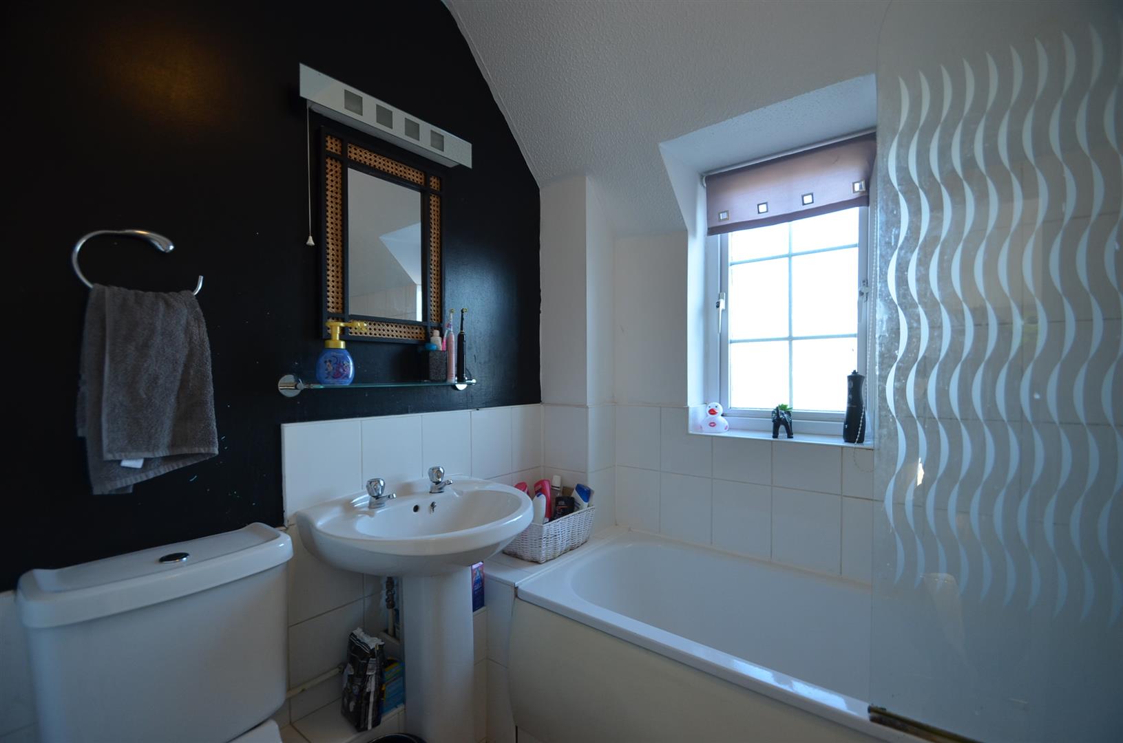 Suite comprising of panelled bath with mixer tap and wall mounted shower attachment, glass shower screen, pedestal wash hand basin, low level w.c, part tiled walls, uPVC double glazed window to front.