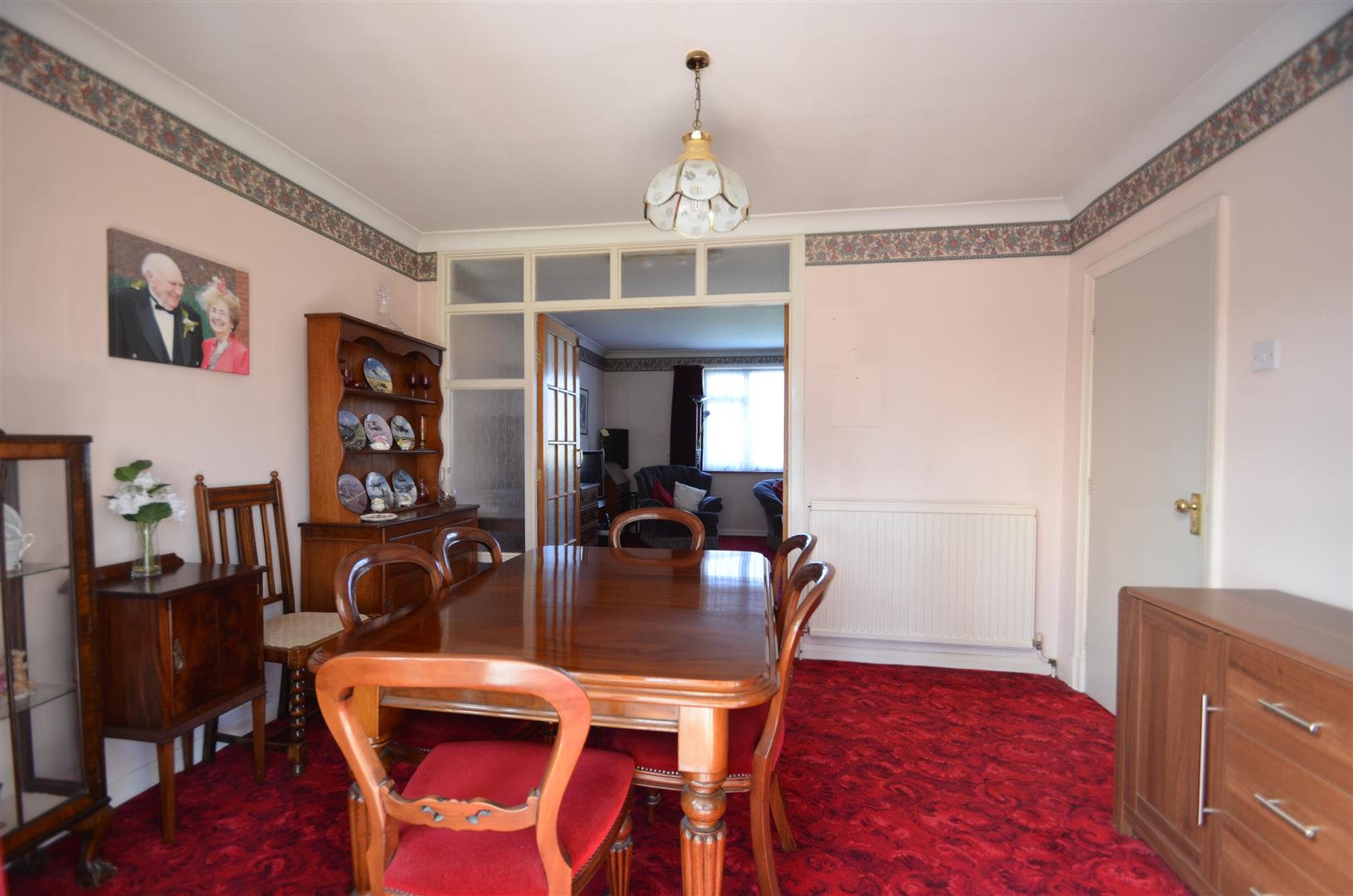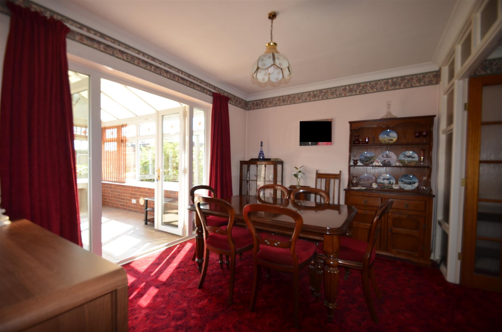 Radiator, French doors to conservatory, door to kitchen.