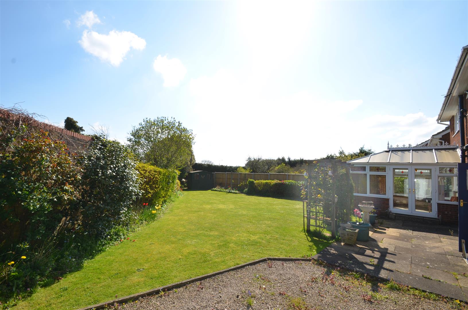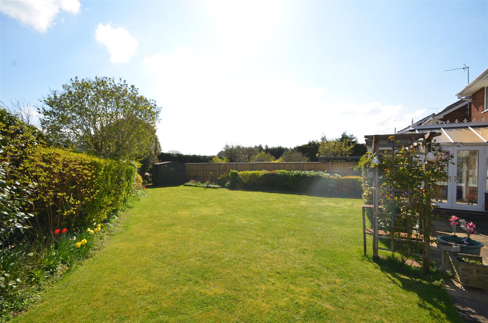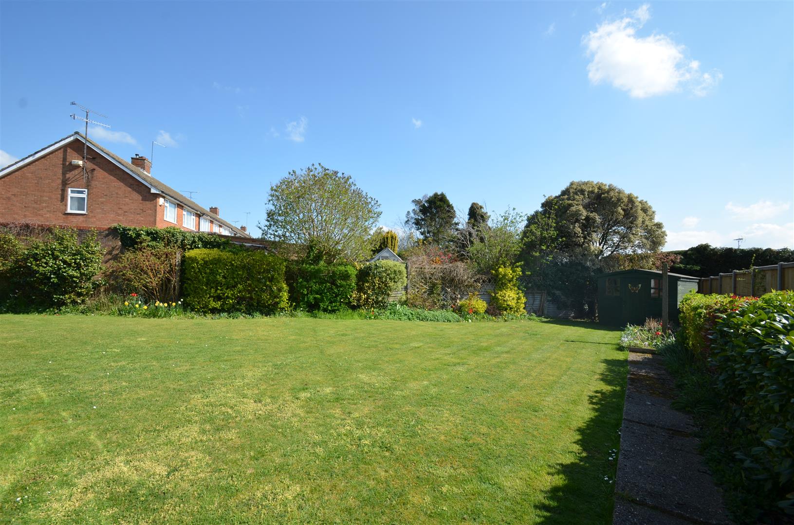 Large fully enclosed garden laid mainly to lawn, variety of trees and shrubs, gated access to front, garden shed.