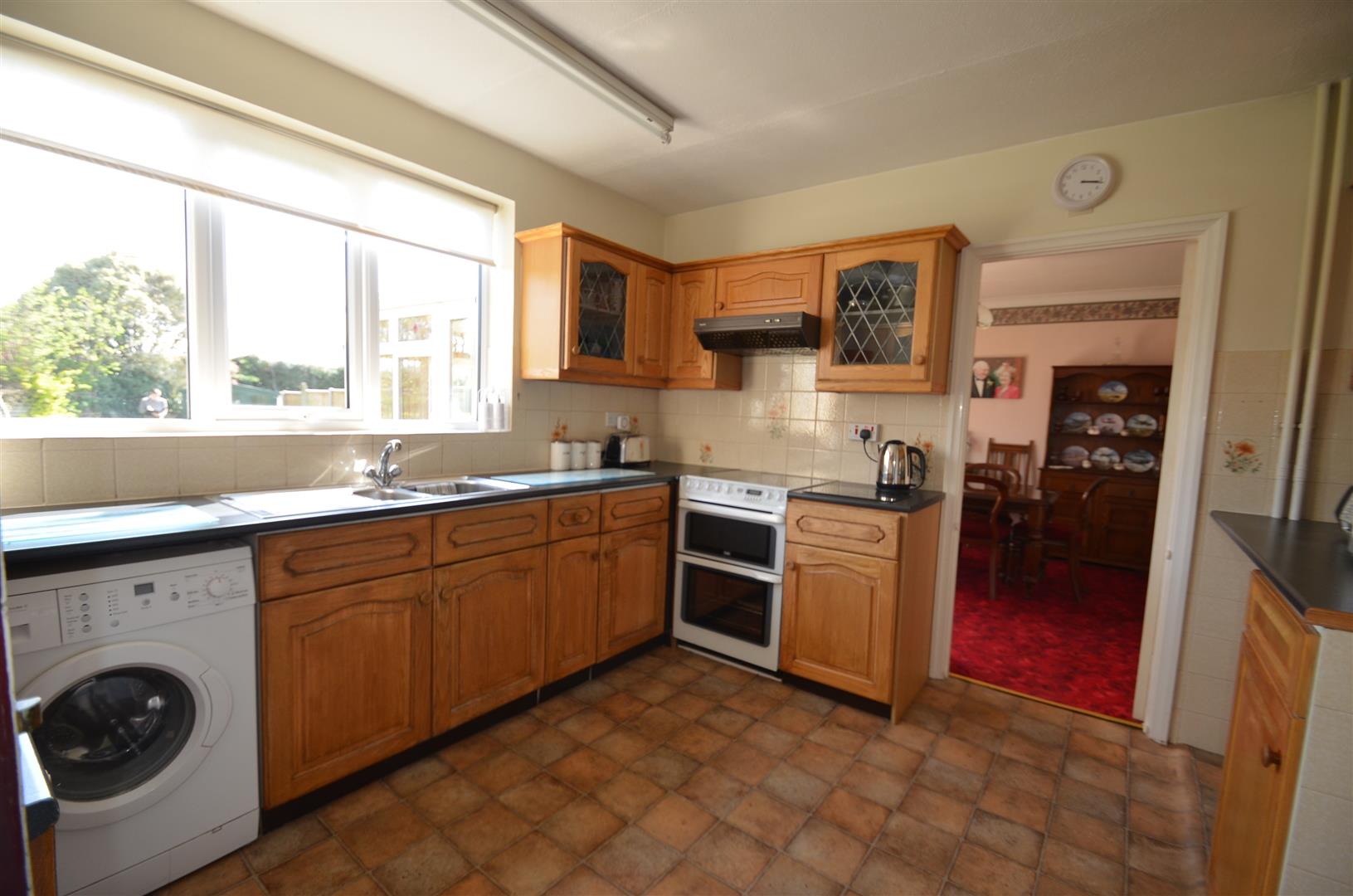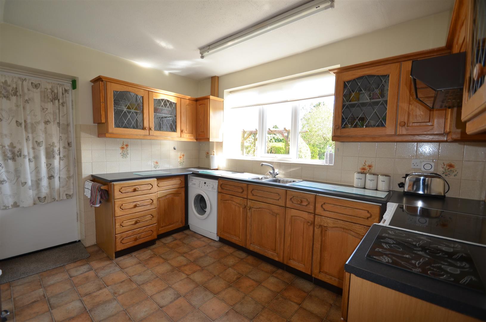 Range of base and eye level units with roll top work surfaces, one and a half stainless steel sink unit with mixer tap, tiled splash back, plumbing for washing machine, electric cooker point, space for upright fridge/freezer, window to rear, door to entra