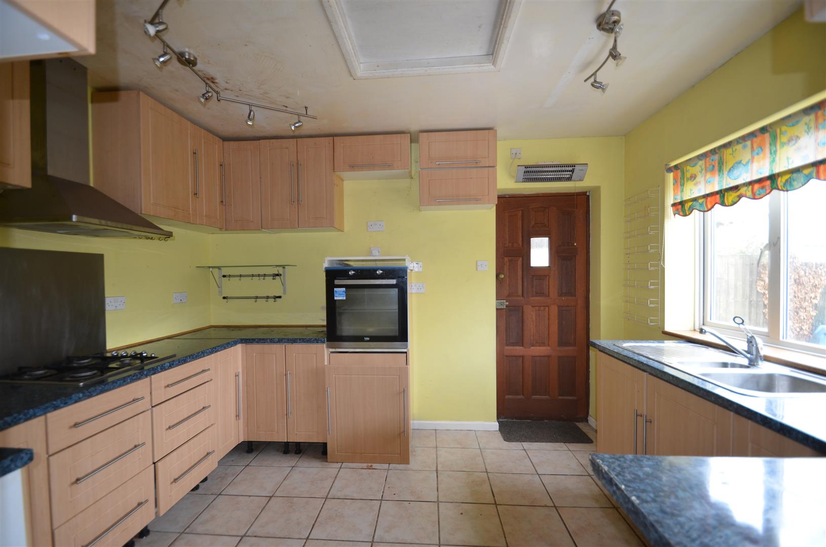Range of base and eye level units with roll top work surfaces, one and a half stainless steel sink unit with mixer tap, integrated gas hob, tiled floor, window to rear, door to garden.