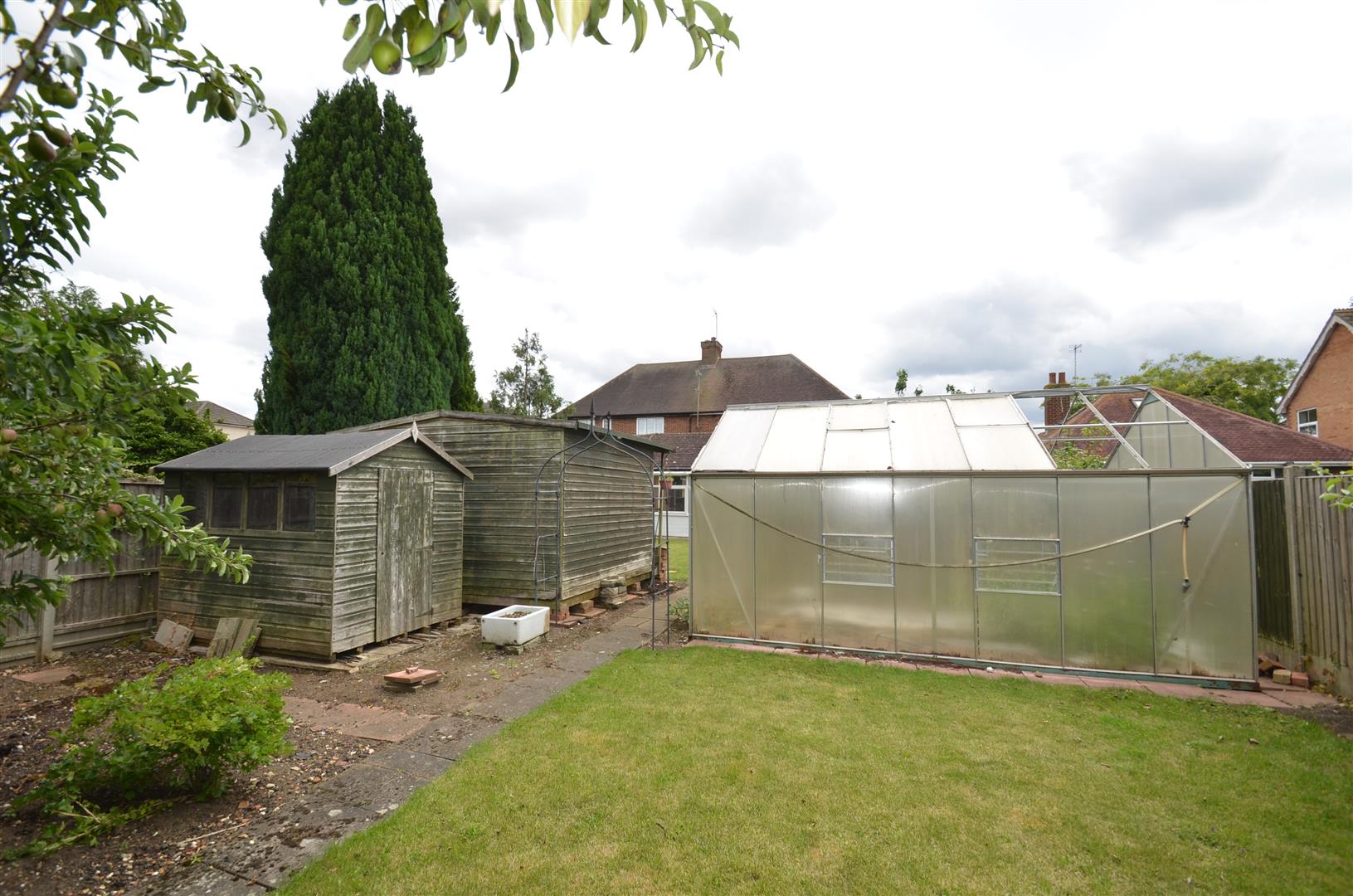 A large fully enclosed garden with paved patio area, rest laid mainly to lawn with garden pond, large green house and garden shed.
