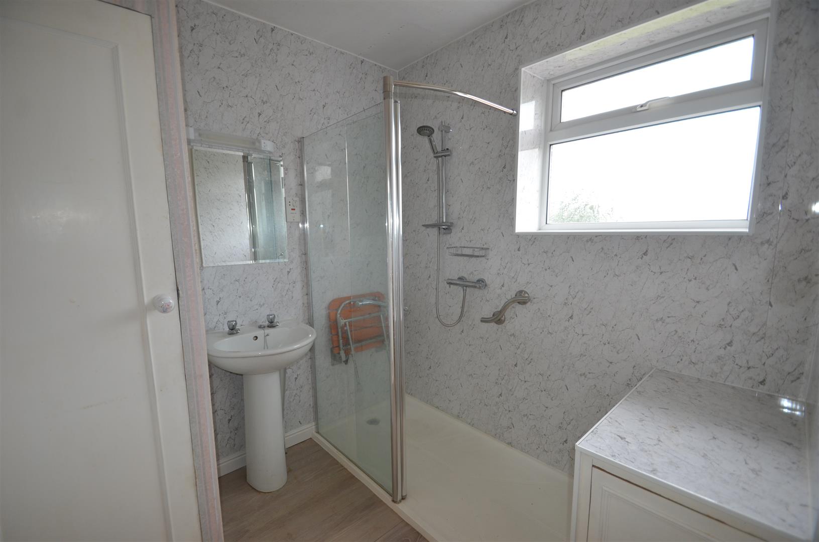 Large walk in double shower with glass screen and wall mounted shower unit, pedestal wash hand basin, window to rear, cupboard housing hot water tank, radiator.