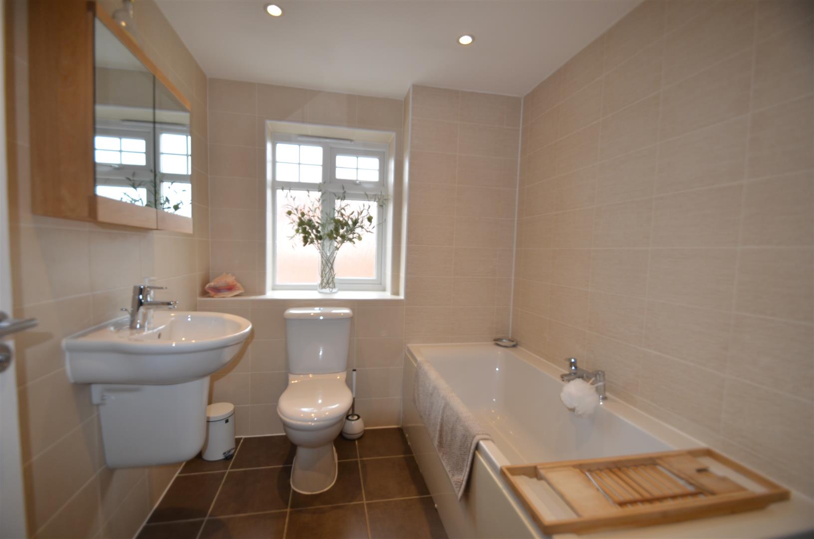 White suite comprising of panel enclosed bath with mixer tap, low level w.c, wall mounted wash hand basin, fully tiled walls, tiled floor, inset spotlights, window to side.