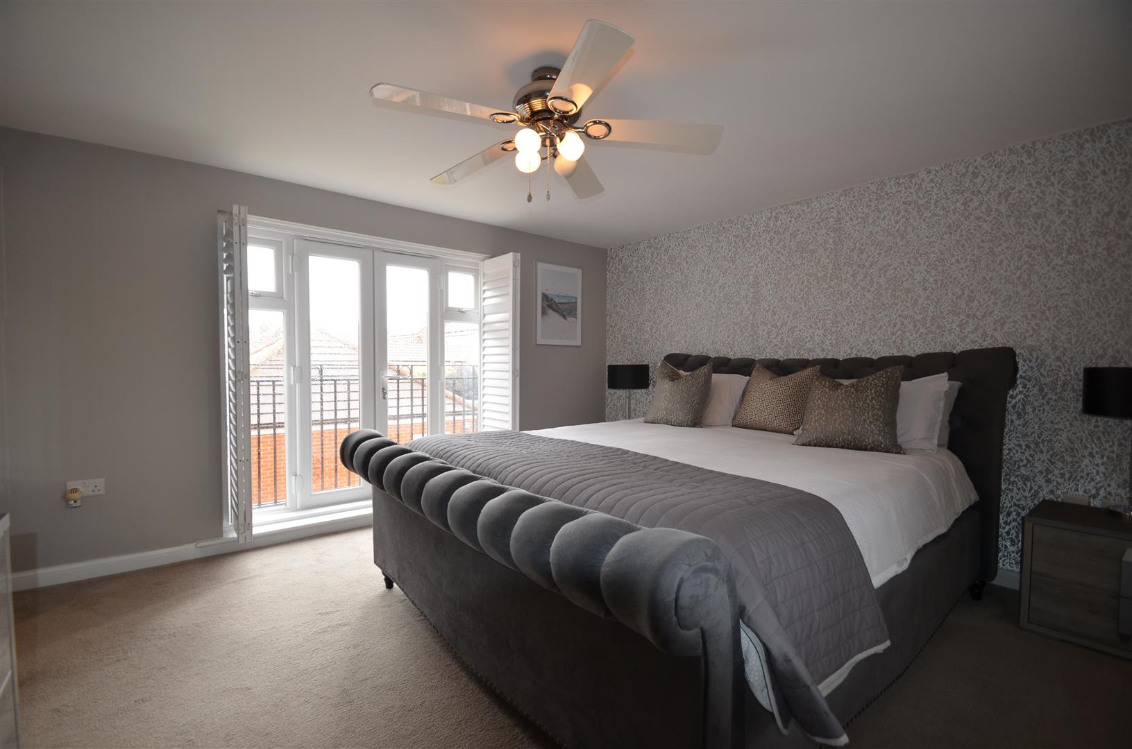 A spacious, dual aspect room with window to side and French doors to Juliet balcony, fitted double wardrobe, radiator, door to:-