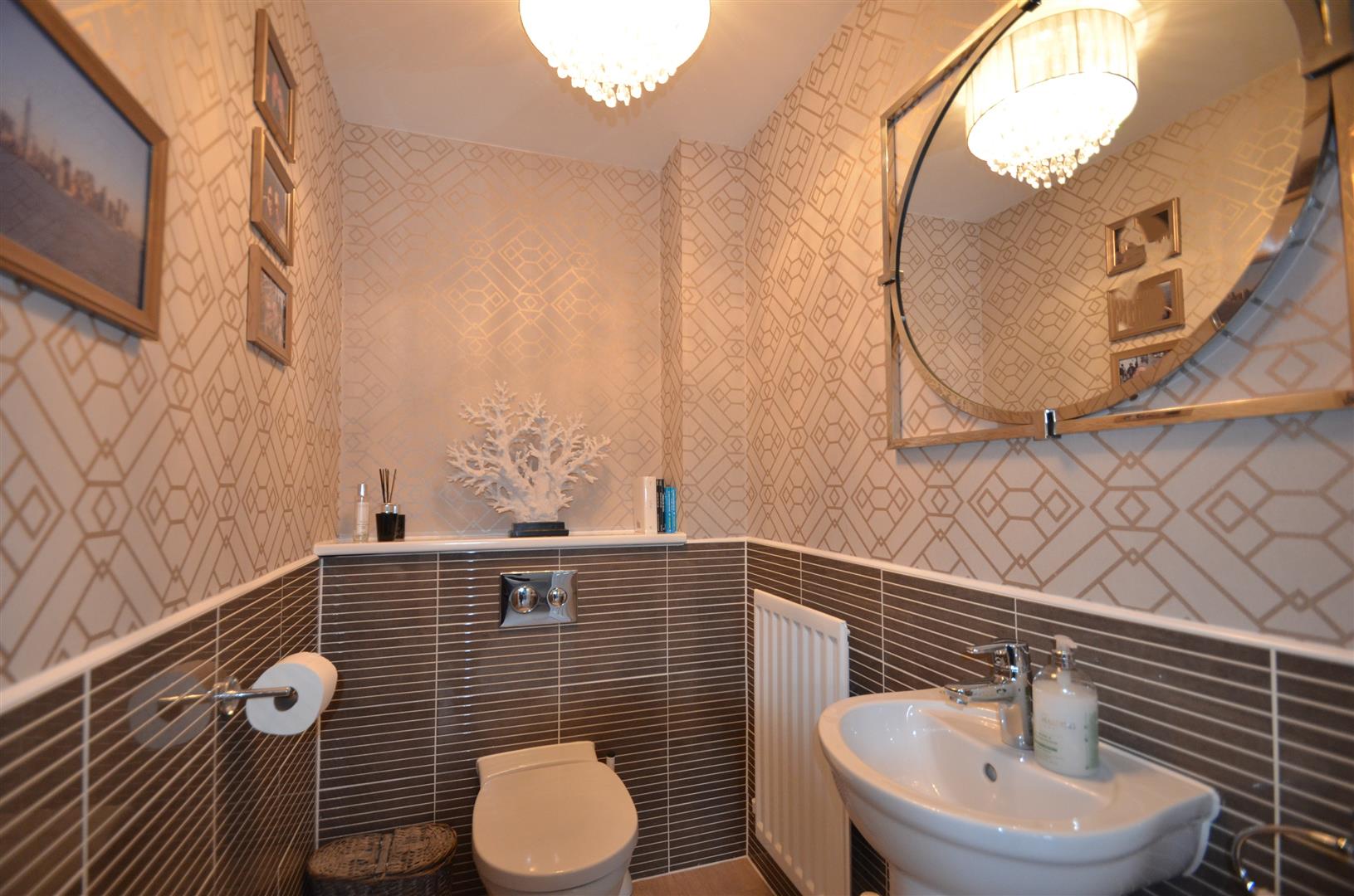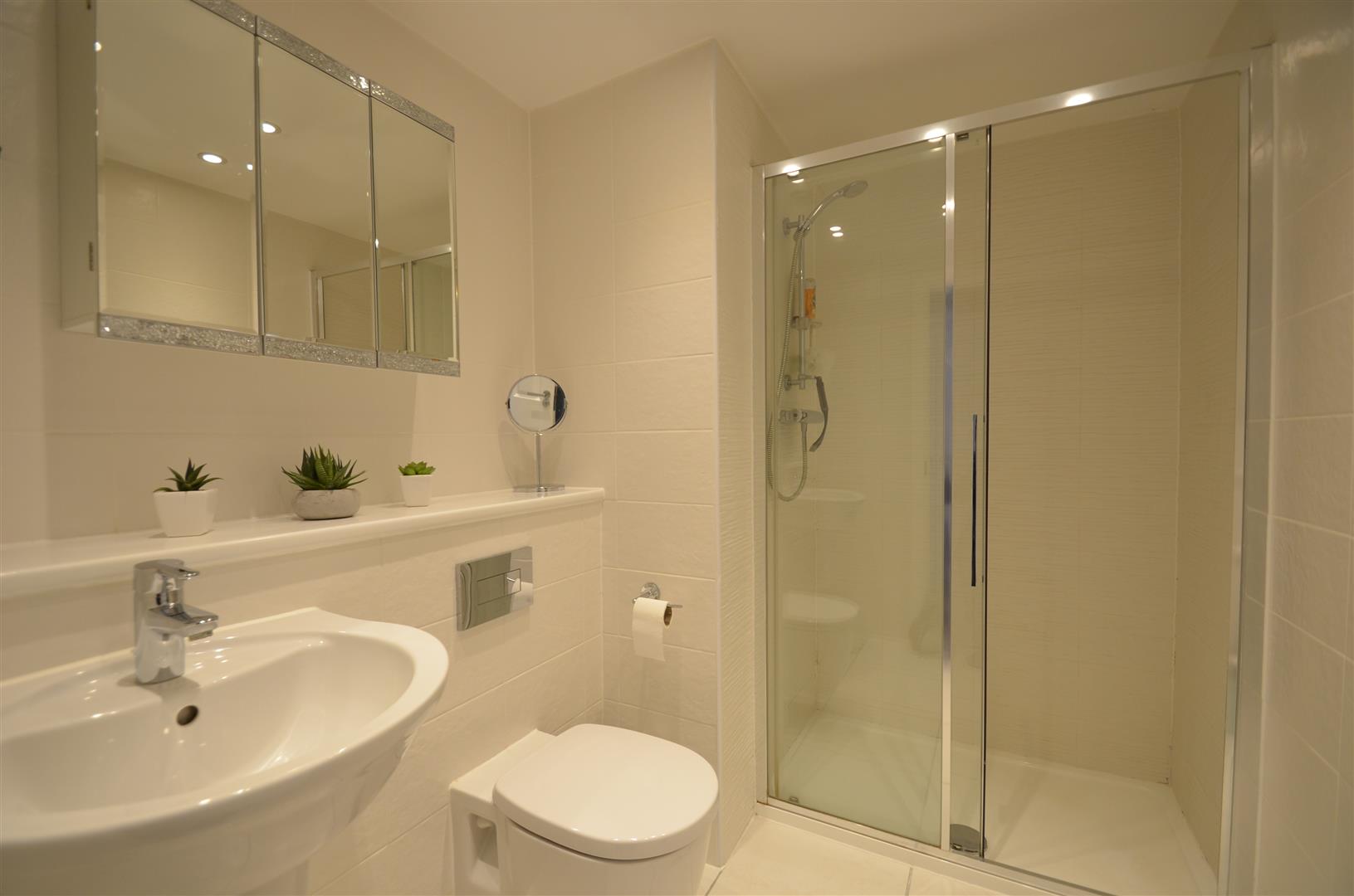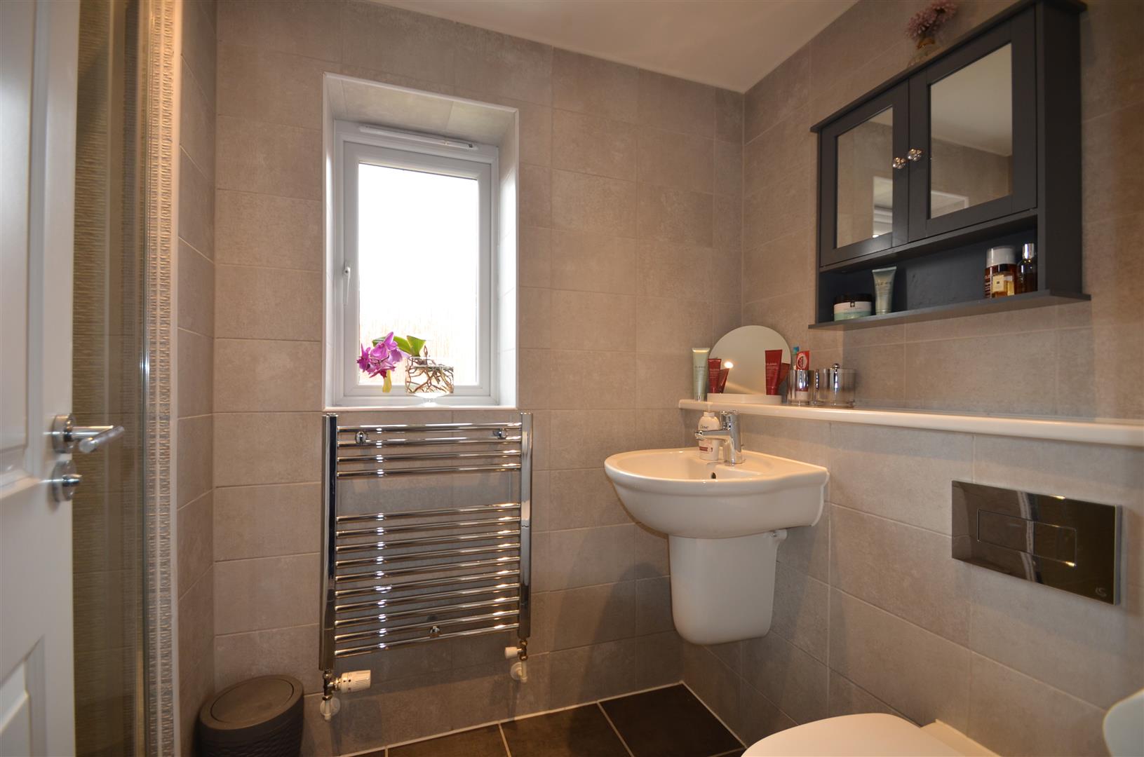 White suite comprising of fully tiled shower cubicle with wall mounted shower, low level w.c, wash hand basin, heated towel rail, part tiled walls, window to rear.