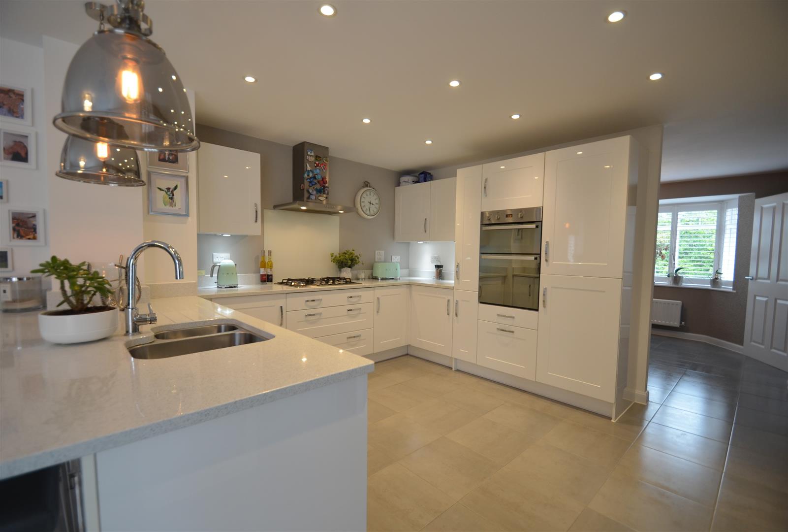 A well fitted kitchen with a range of base and eye level units with quartz top work surfaces incorporating a breakfast bar area, inset sink unit with mixer tap, integrated eye level double oven, gas hob with stainless steel extractor hood, integrated frid