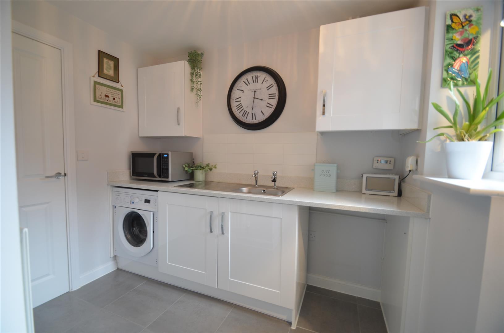 Fitted base and wall mounted units with quartz top work surface, stainless steel sink unit, integrated washing machine, wall mounted gas boiler, tiled floor, door to garden.