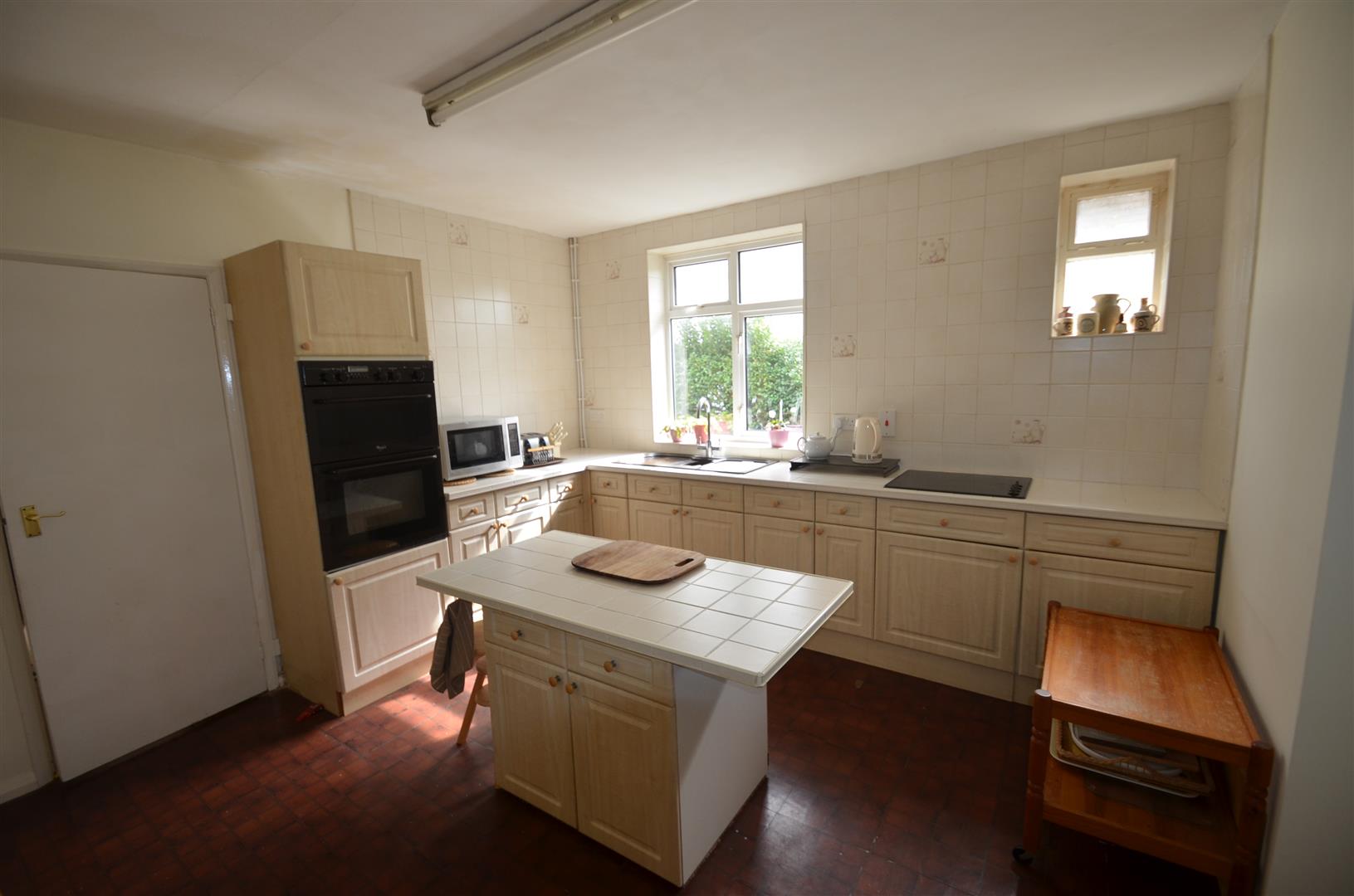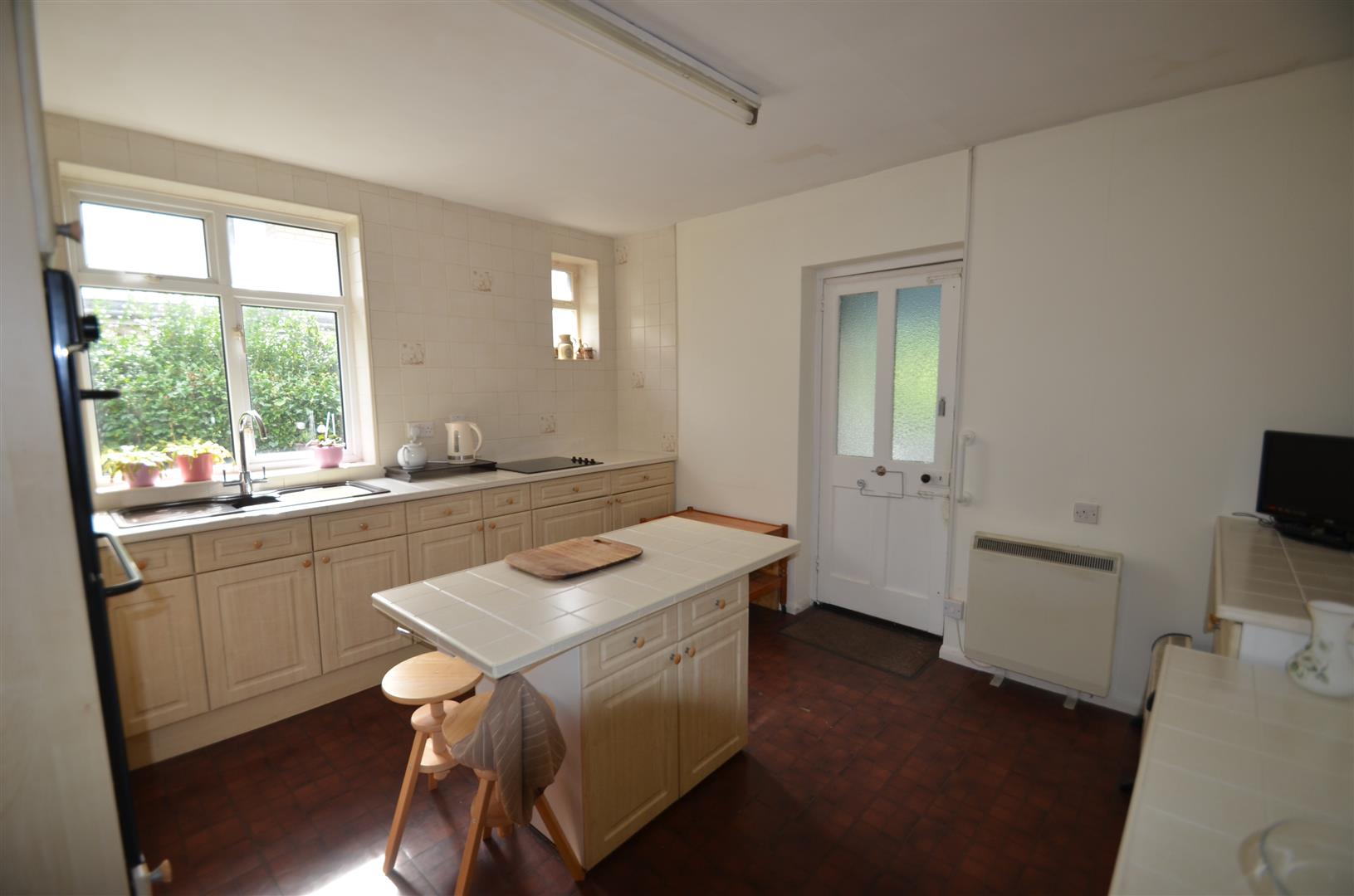 Fitted kitchen with a range of base and eye level units with roll top work surfaces, one and a half acrylic sink unit, eye level oven, integrated electric hob, part tiled walls, storage heater, two windows to side, door to:-