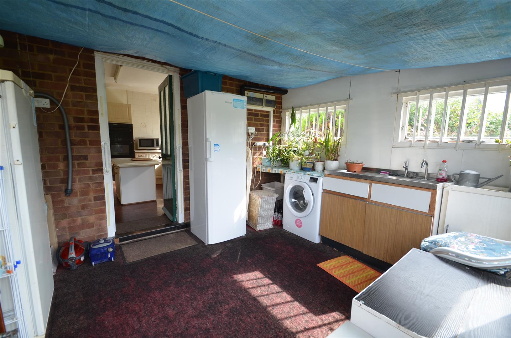 Timber construction. Base unit with stainless steel sink unit, plumbing for washing machine, fuse board, door to garden.