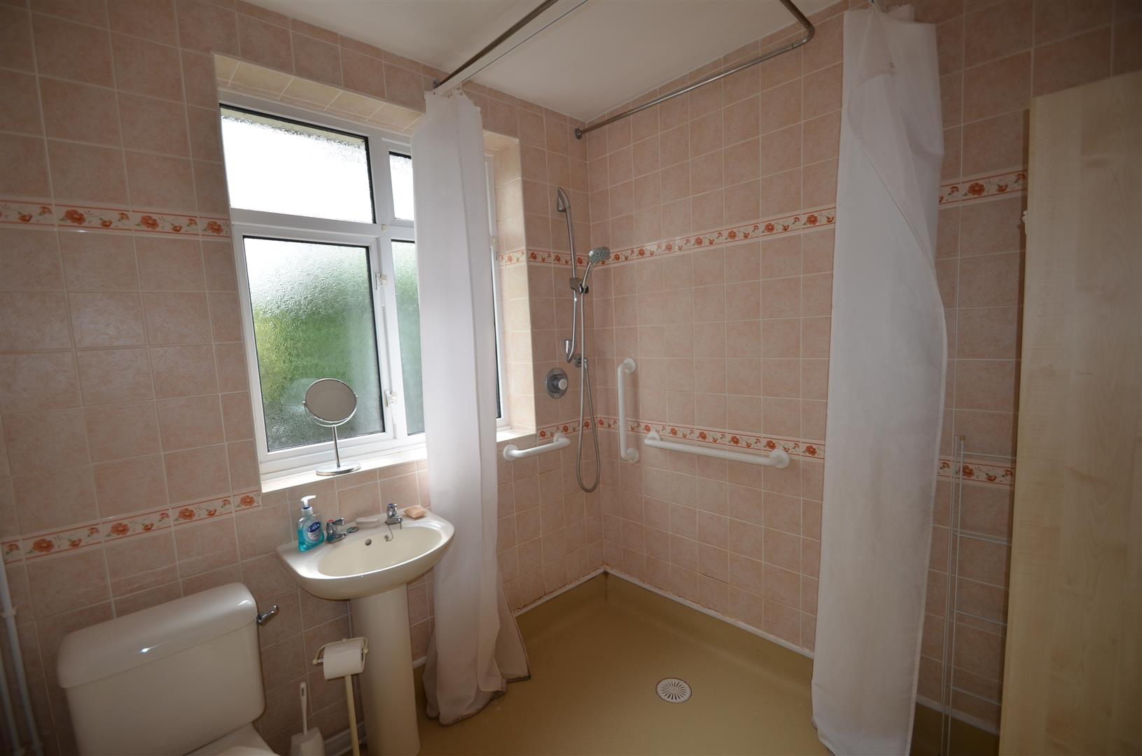 Suite comprising of low level w.c, pedestal wash hand basin, fully tiled walls with wall mounted shower, window to side, storage heater.