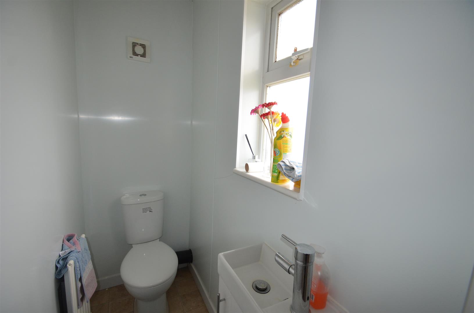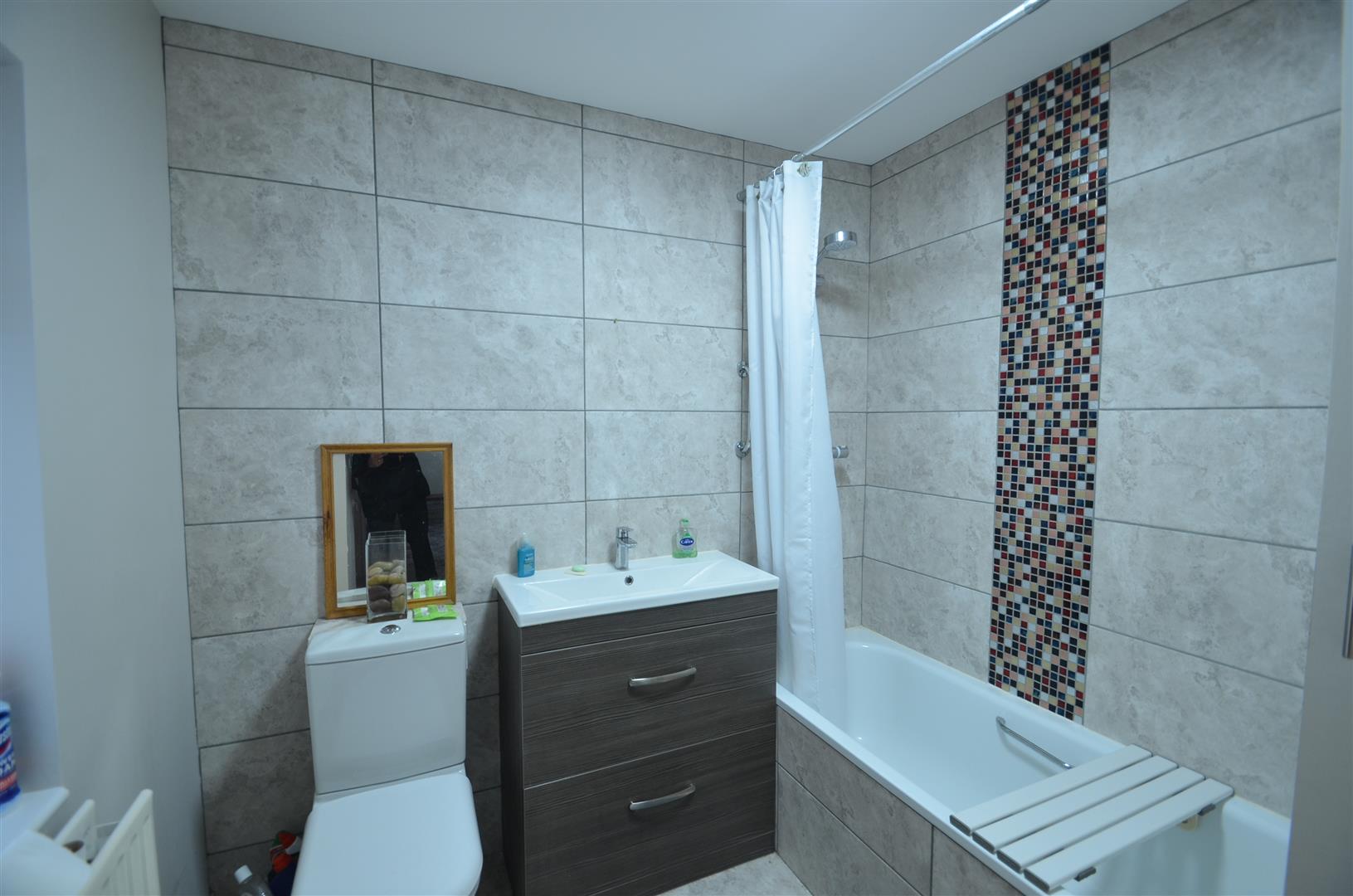 Refitted white suite comprising of enclosed bath, low level w.c, wash hand basin in vanity unit, fully tiled walls, tiled floor, radiator, window to front.