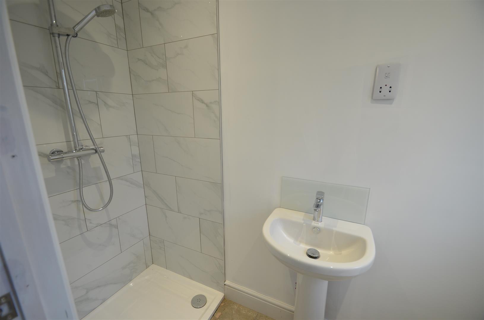 White suite comprising of fully tiled shower cubicle with wall mounted shower, low level w.c, wash hand basin, part tiled walls, window to rear.
