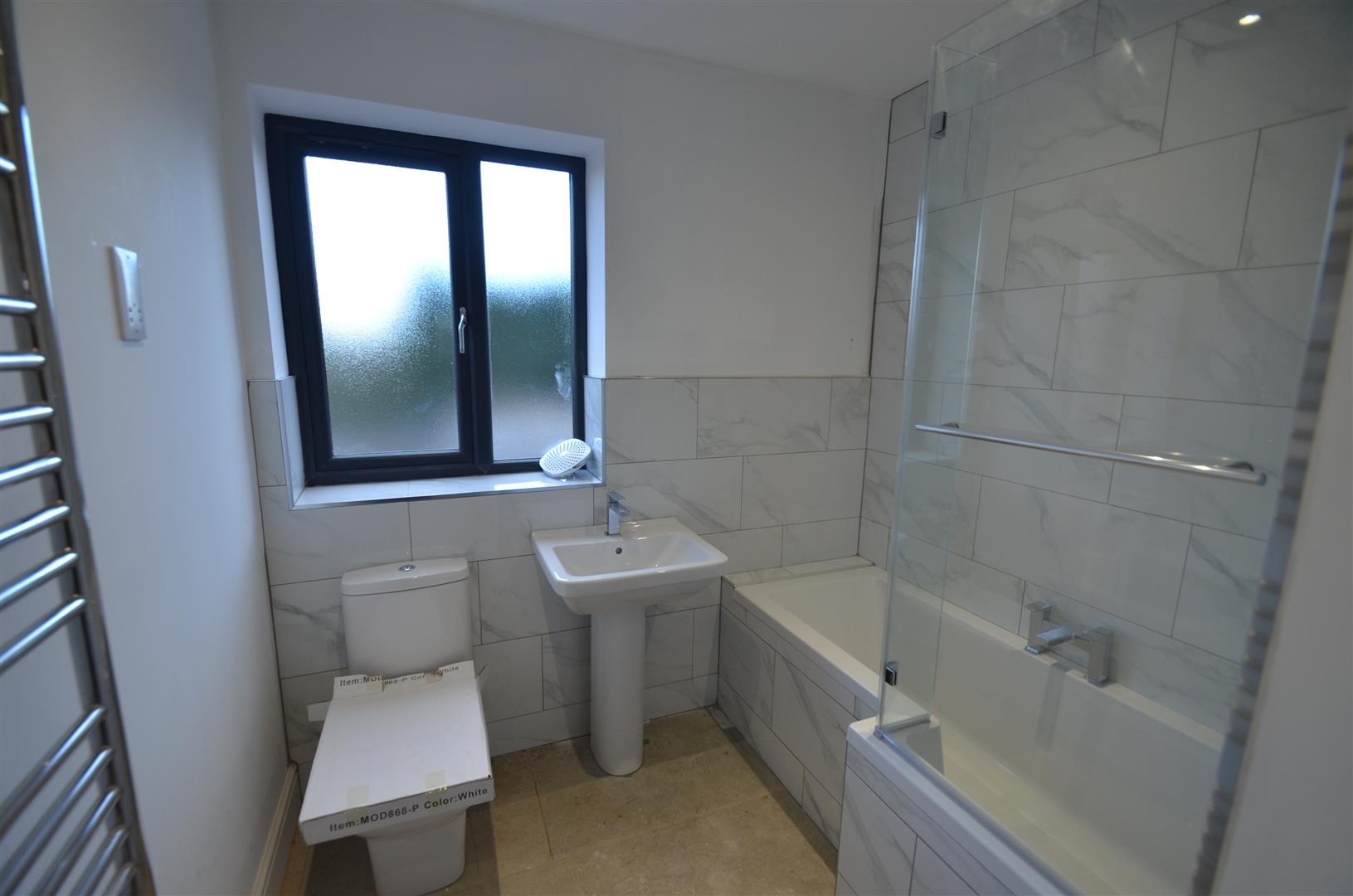 White suite comprising of panel enclosed bath with mixer tap, wall mounted shower, glass shower screen, low level w.c, wash hand basin, part tiled walls, heated towel rail, window to front.