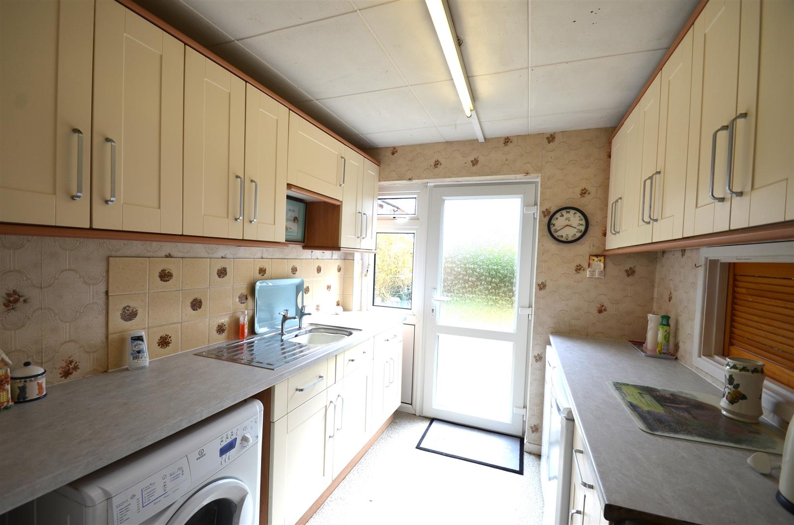 Range of base and eye level units with roll top work surfaces, stainless steel sink unit, tiled splash back, plumbing for washing machine, service hatch to dining room, uPVC double glazed window and door to garden.