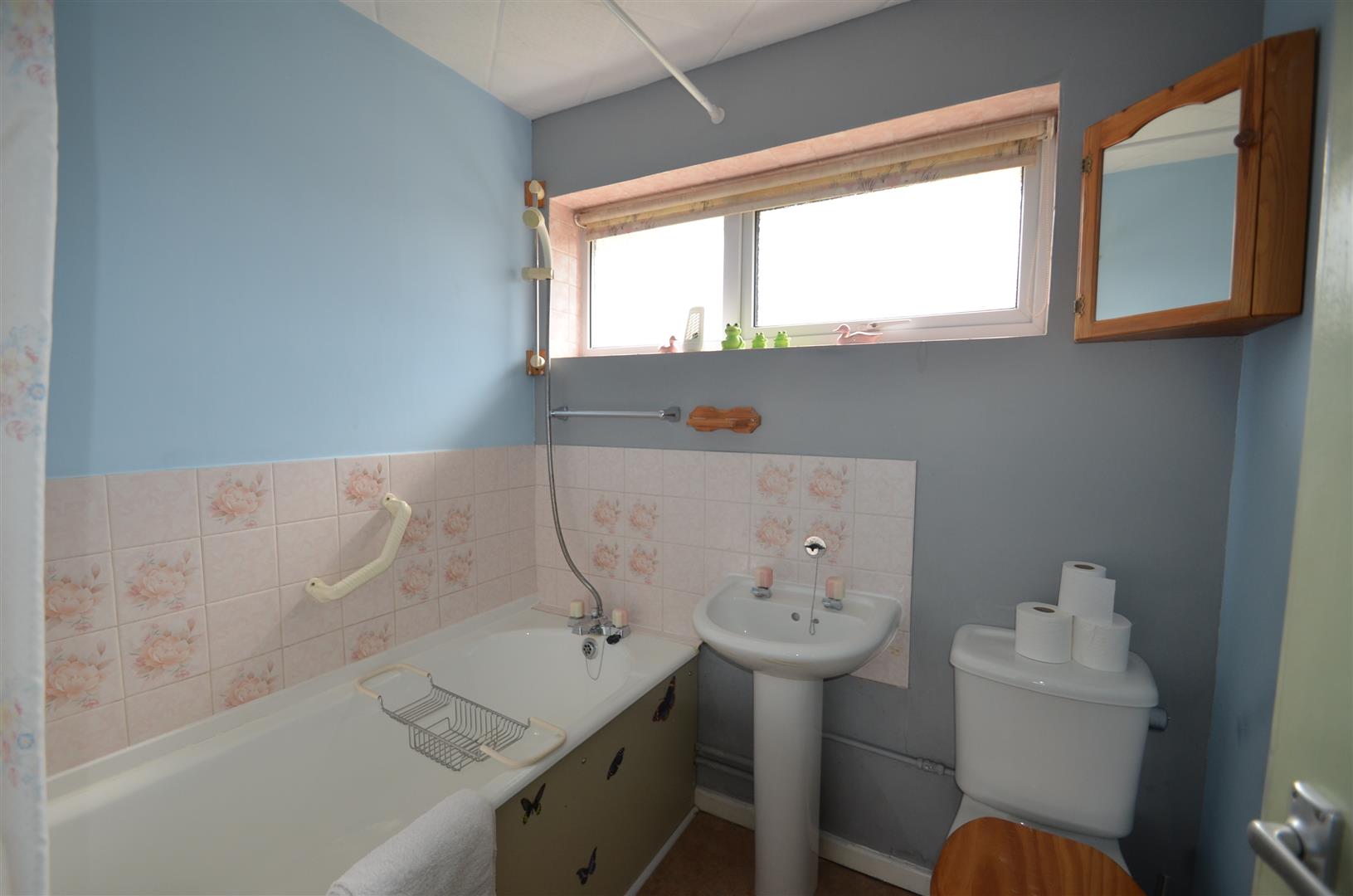 Suite comprising of panel enclosed bath with mixer tap and shower attachment, pedestal wash hand basin, low level w.c, part tiled walls, window to rear, radiator.