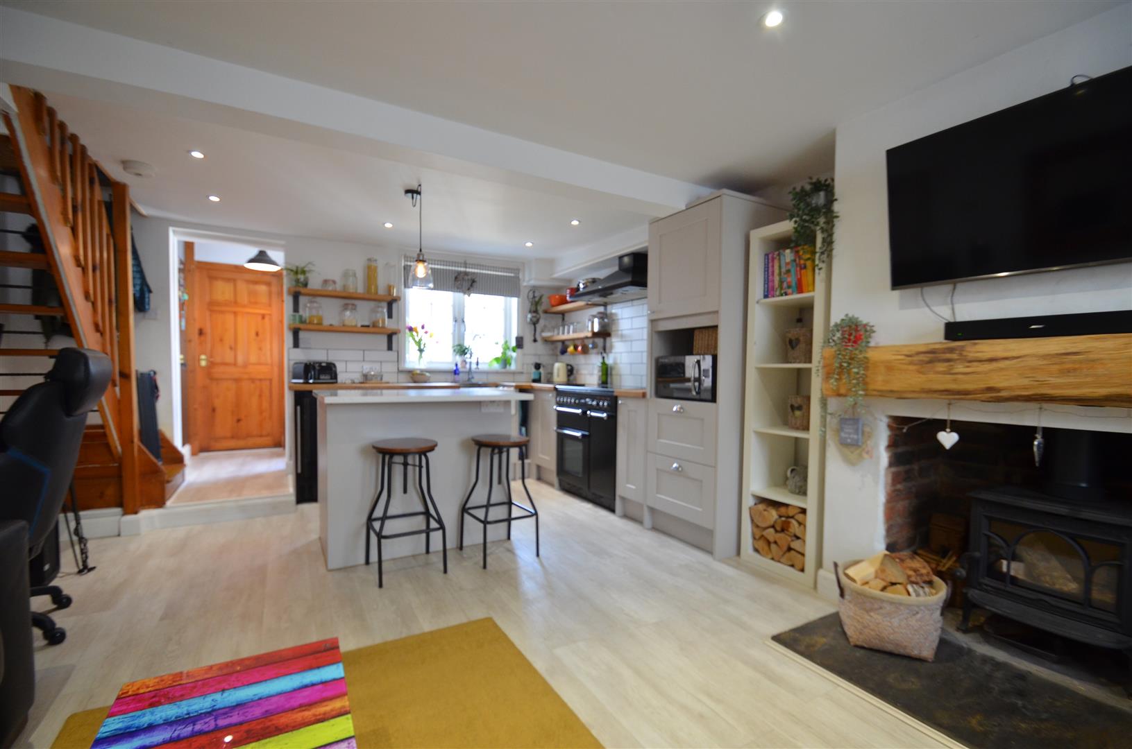 A large open plan room with window to front, entrance door, radiator, inset spotlights, open fire with freestanding log burner, opening into:-
