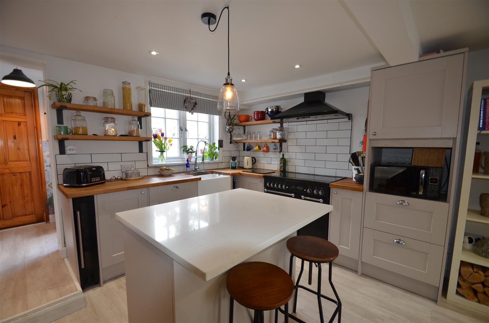 A well fitted kitchen with a range of base and eye level units with roll top work surfaces, inset butler sink with mixer tap, freestanding range master cooker, integrated dishwasher and wine cooler, island with matching quartz top surface creating breakfa