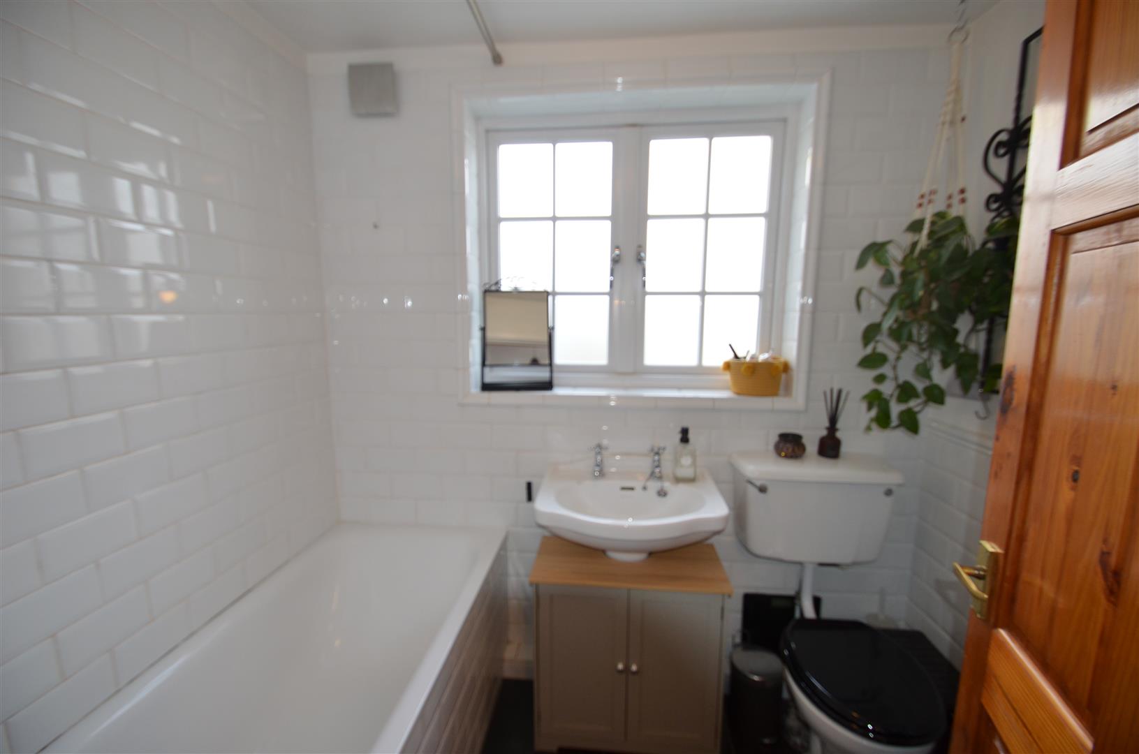 White suite comprising of panel enclosed bath with mixer tap and shower attachment, low level w.c, wash hand basin, part tiled walls, radiator, window to rear.
