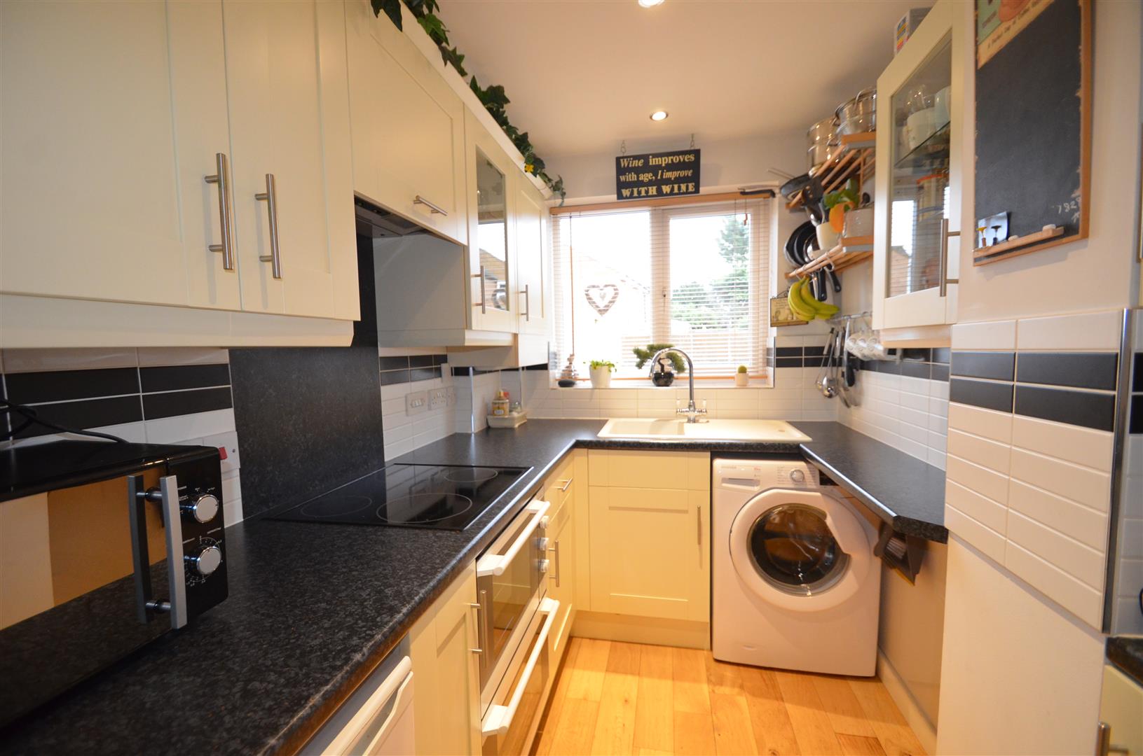 Well fitted kitchen with a range of base and eye level units with roll top work surfaces and under cupboard lighting, integrated electric double oven and hob, inset acrylic sink unit with mixer tap, tiled splash back, plumbing for washing machine, inset s