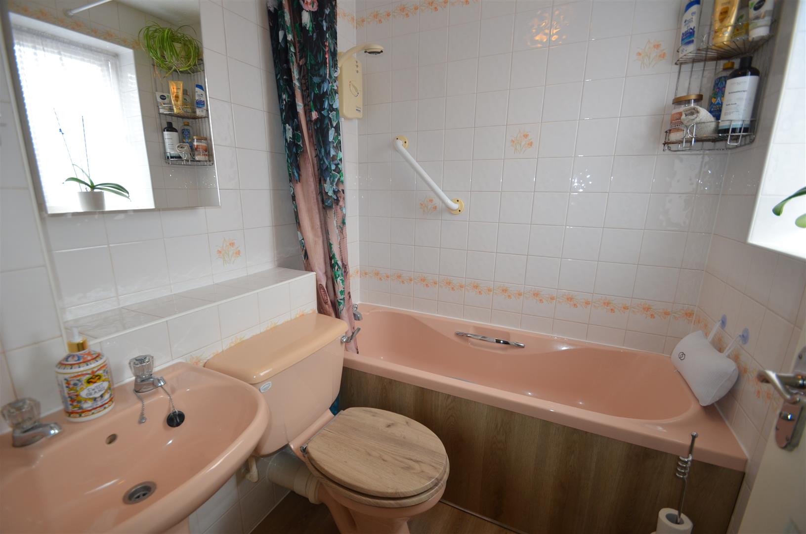Suite comprising of panel enclosed bath with mixer tap and wall mounted shower, low level w.c, pedestal wash hand basin, heated towel rail, fully tiled walls, access to loft space.
