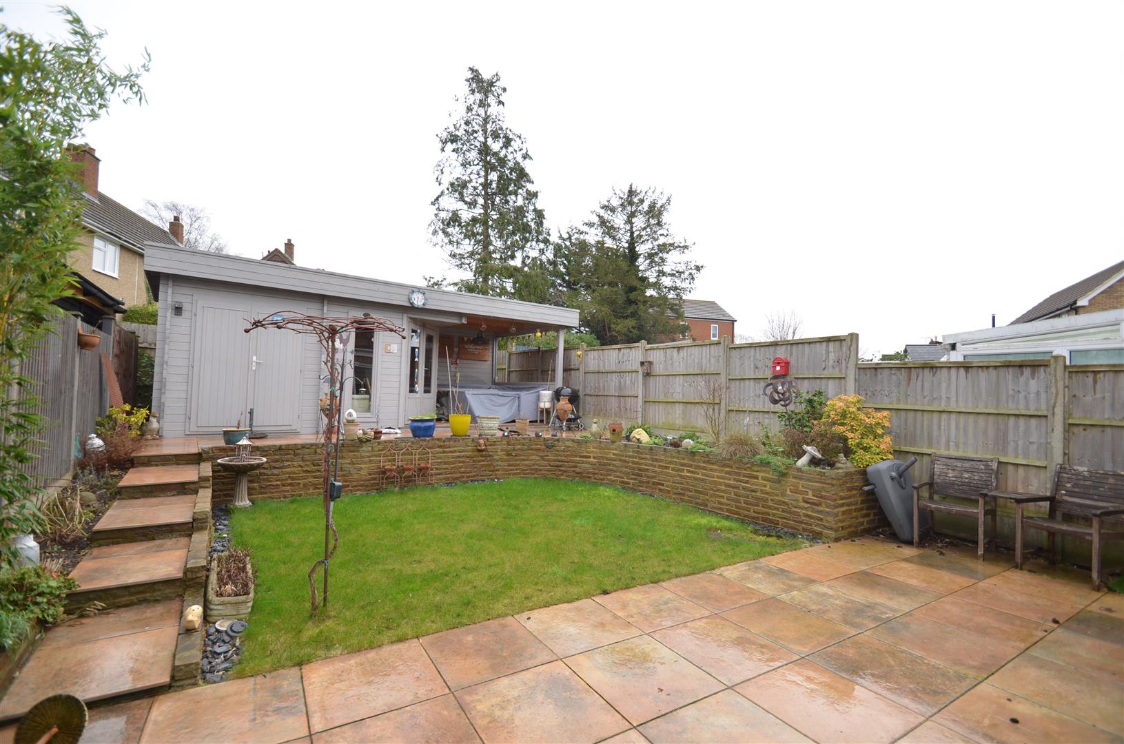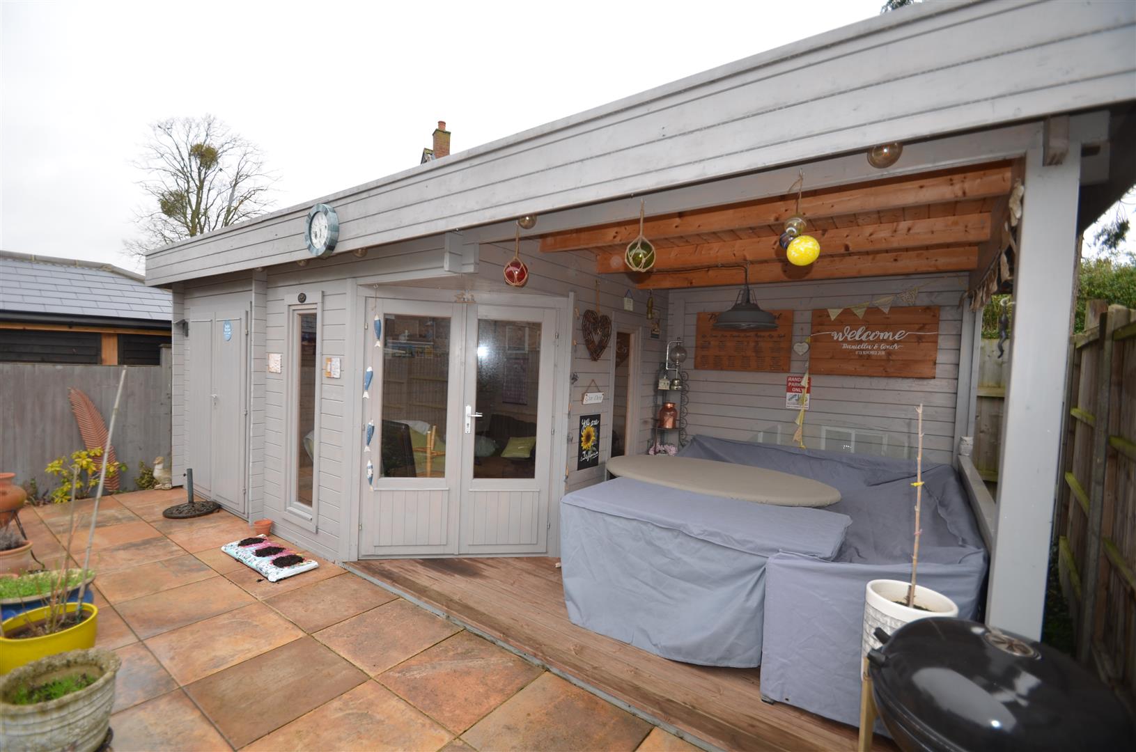 A fully enclosed garden with paved patio area, rest laid to lawn with steps leading up to further patio area with large summer house, covered seating area and garden shed, gated access to front.