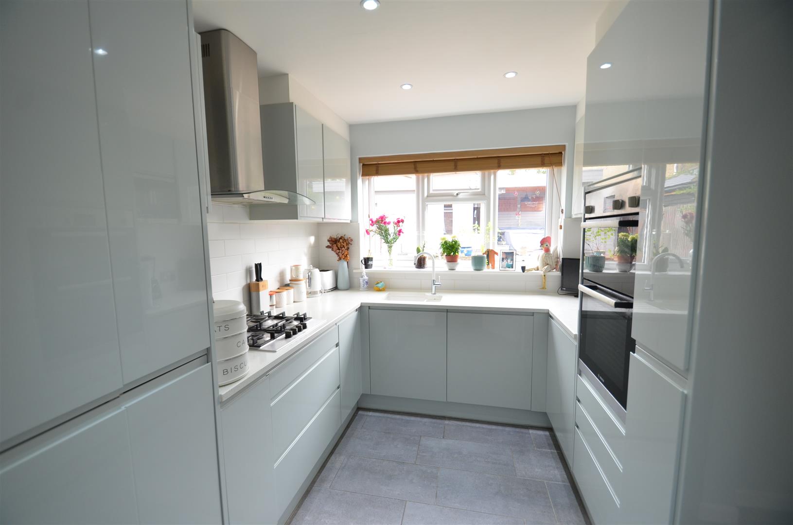 A well fitted kitchen with a range of base and eye level units with quartz top work surfaces, inset sink unit with mixer tap, eye level double oven, integrated gas hob with stainless steel extractor hood, eye level microwave, integrated fridge/freezer, di