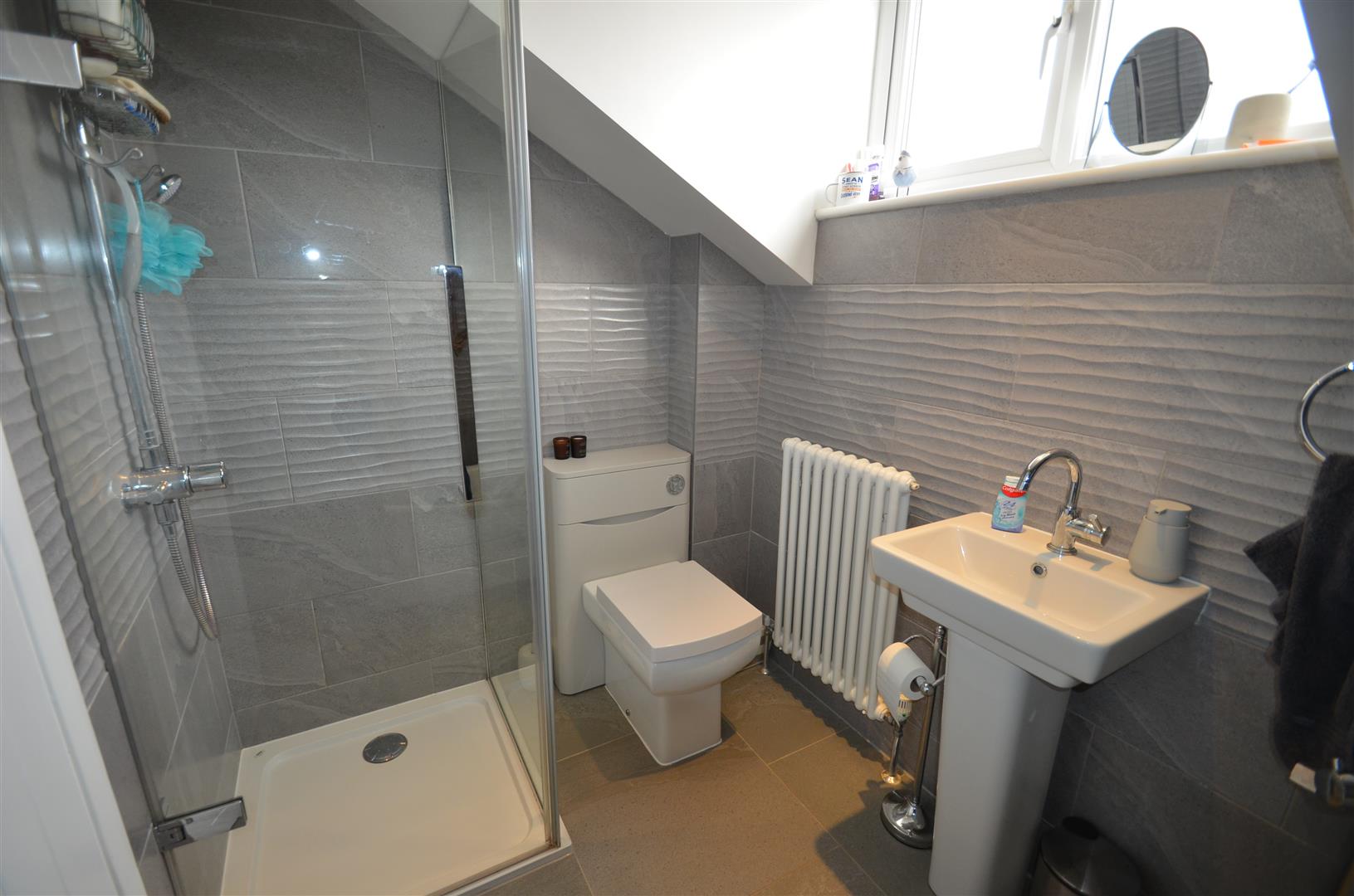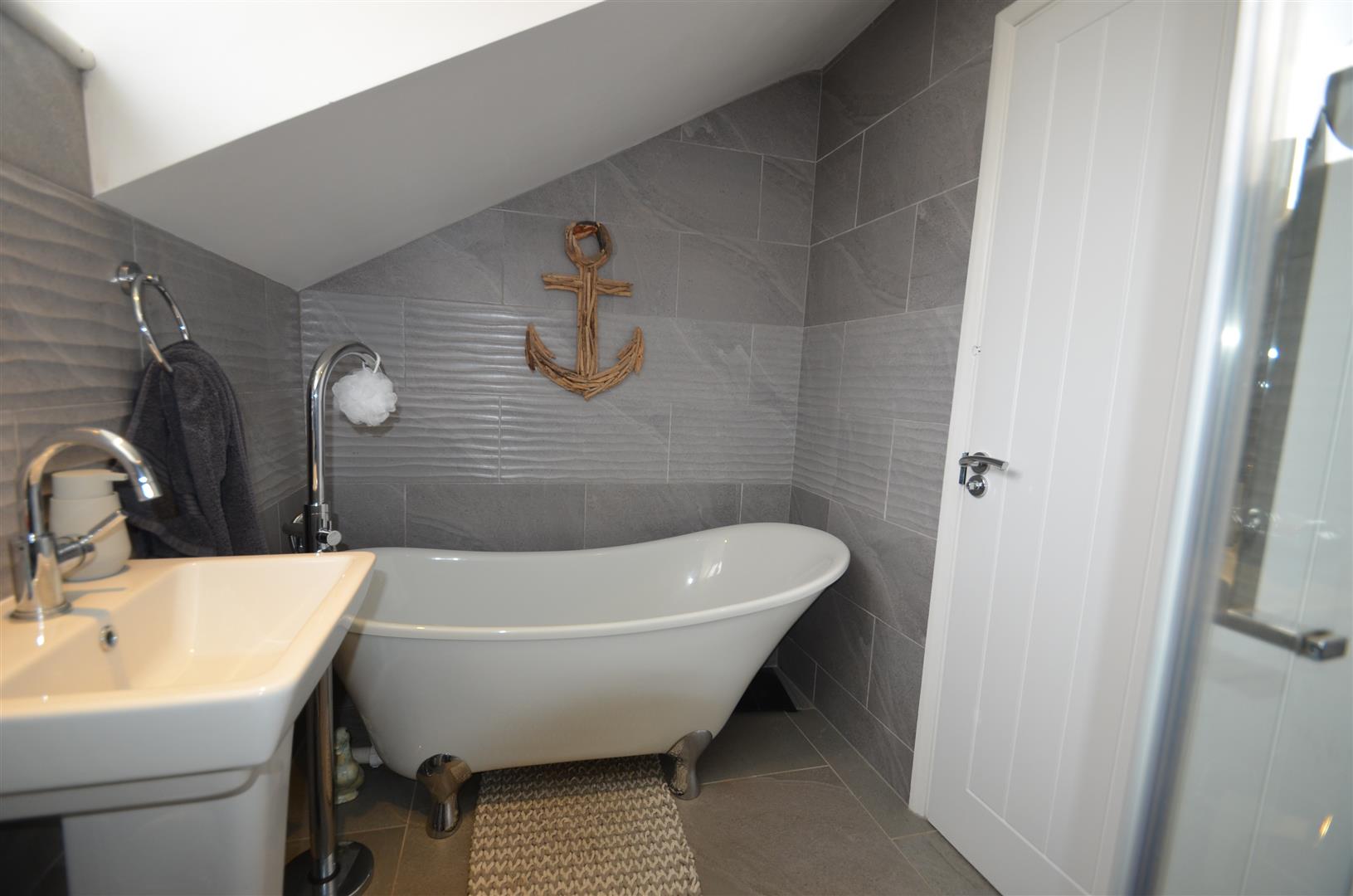 A lovely, refitted bathroom suite with freestanding roll top bath, fully tiled shower cubicle, pedestal wash hand basin, low level w.c, extractor fan, radiator, inset spotlights, tiled flooring, window to rear.