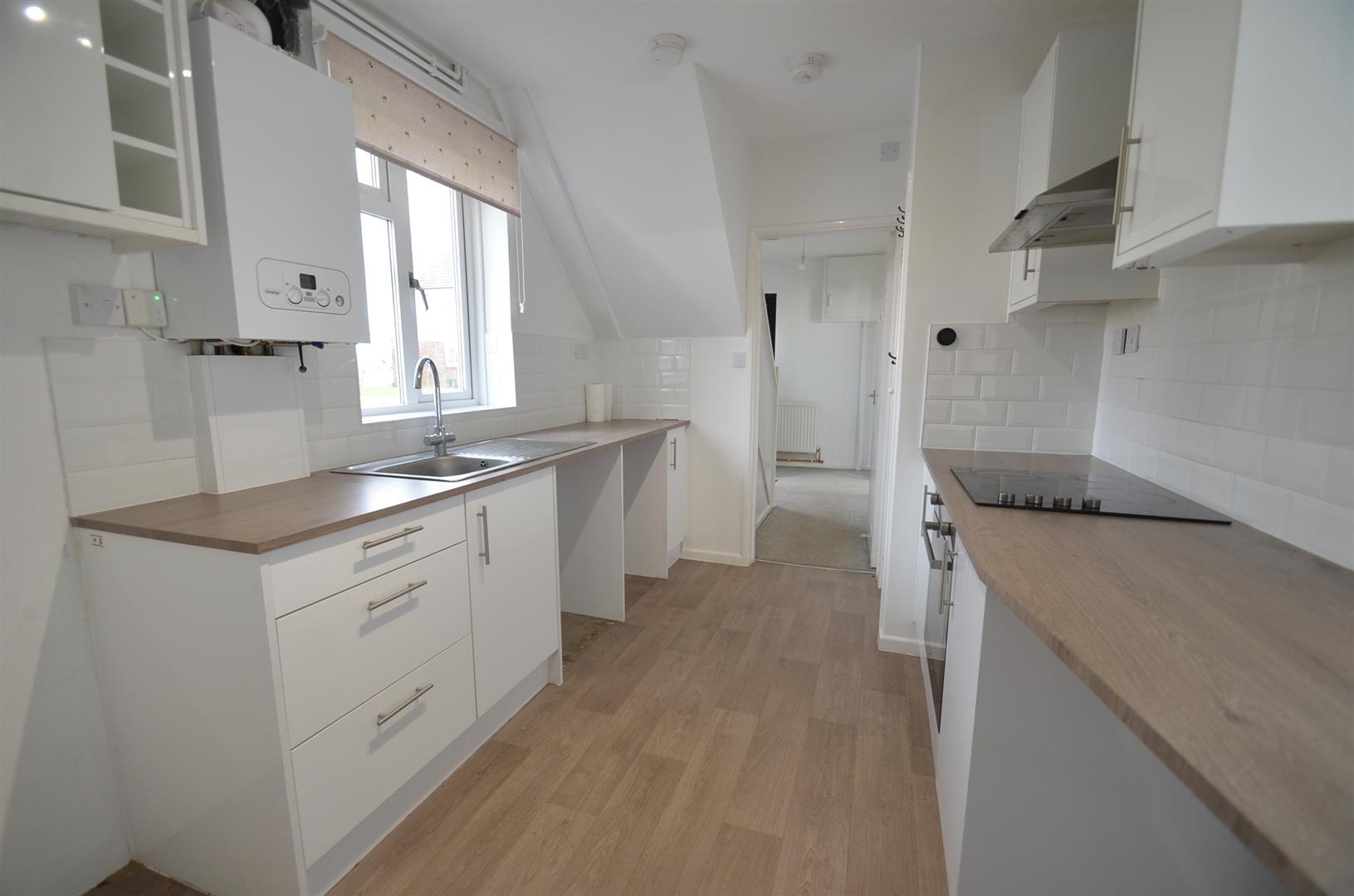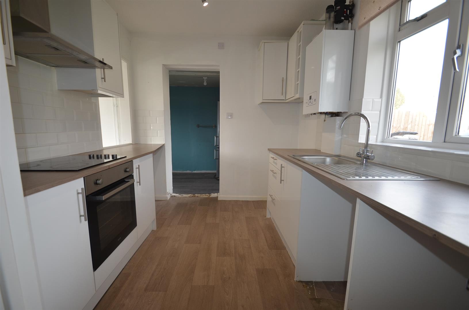 Range of base and eye level units with roll top work surfaces, stainless steel sink unit with mixer tap, wall mounted gas boiler, window to front.