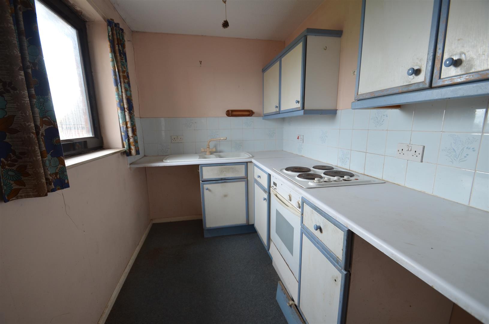 Kitchen with a range of base and eye level units with roll top work surfaces, inset one and a half sink unit with mixer tap, integrated oven and hob, plumbing for washing machine, tiled splashback, window to side.